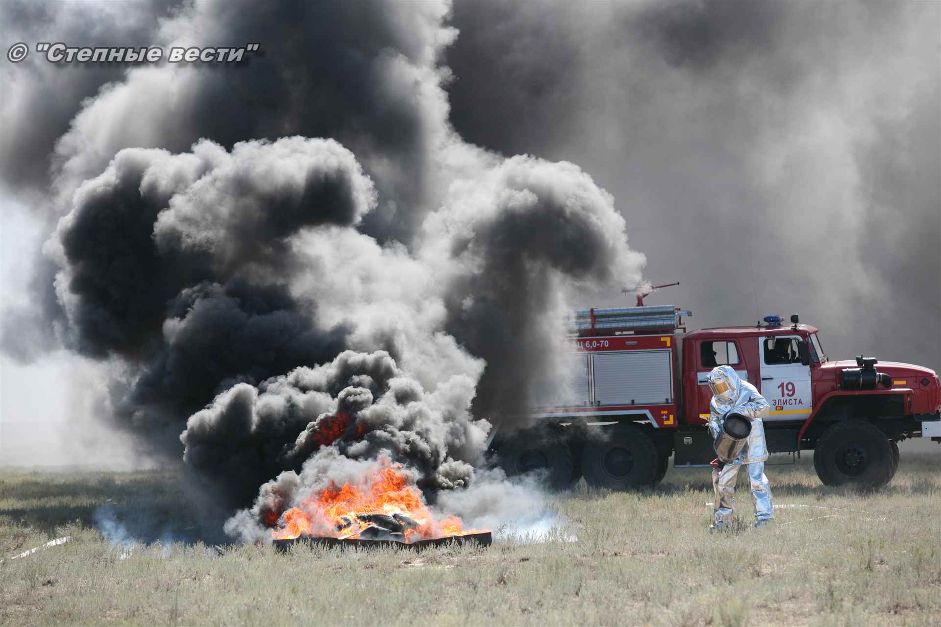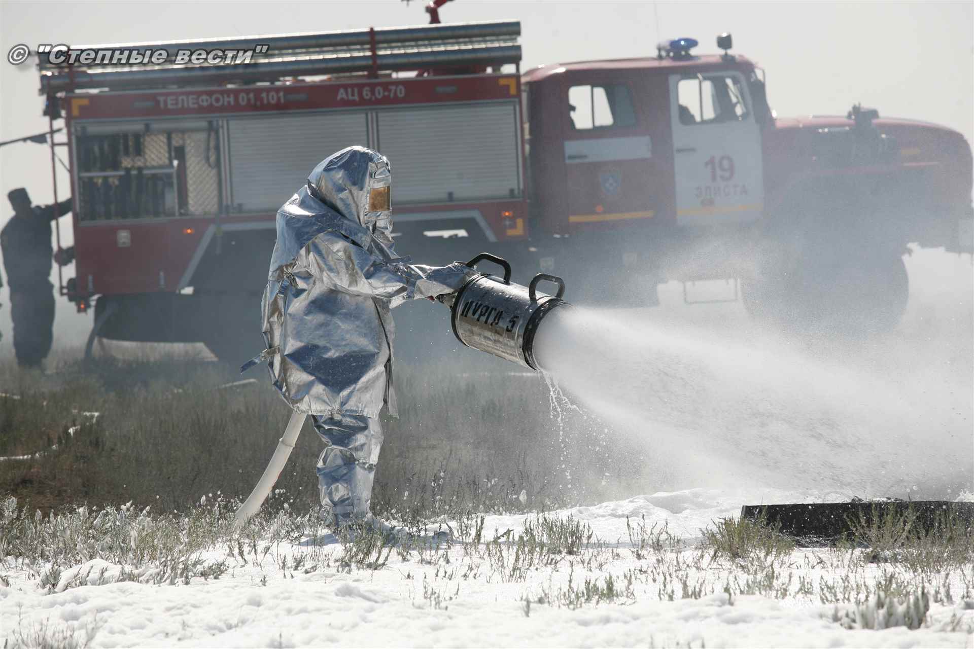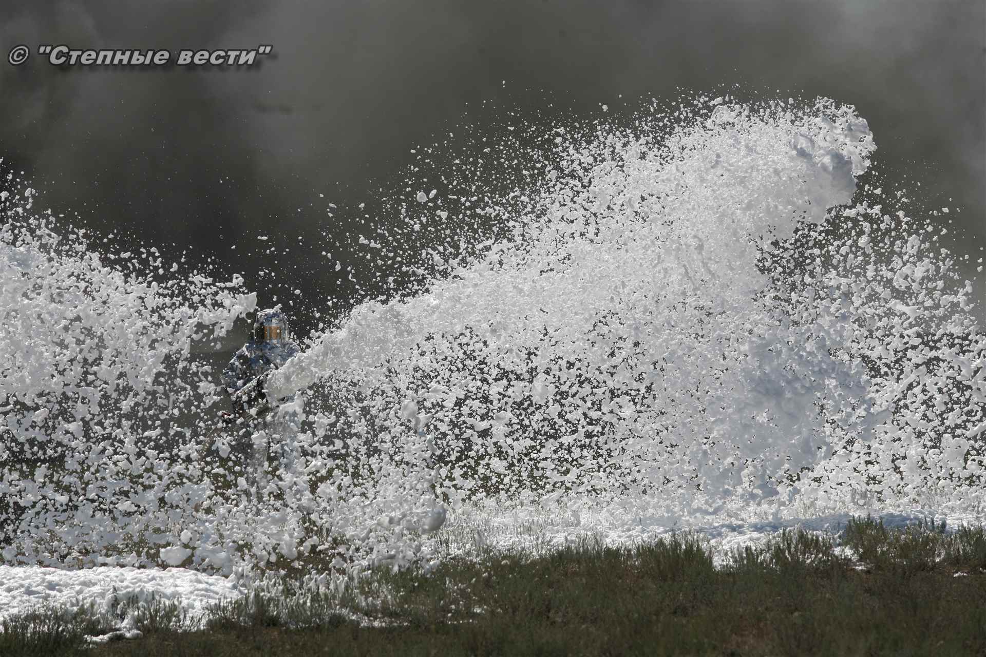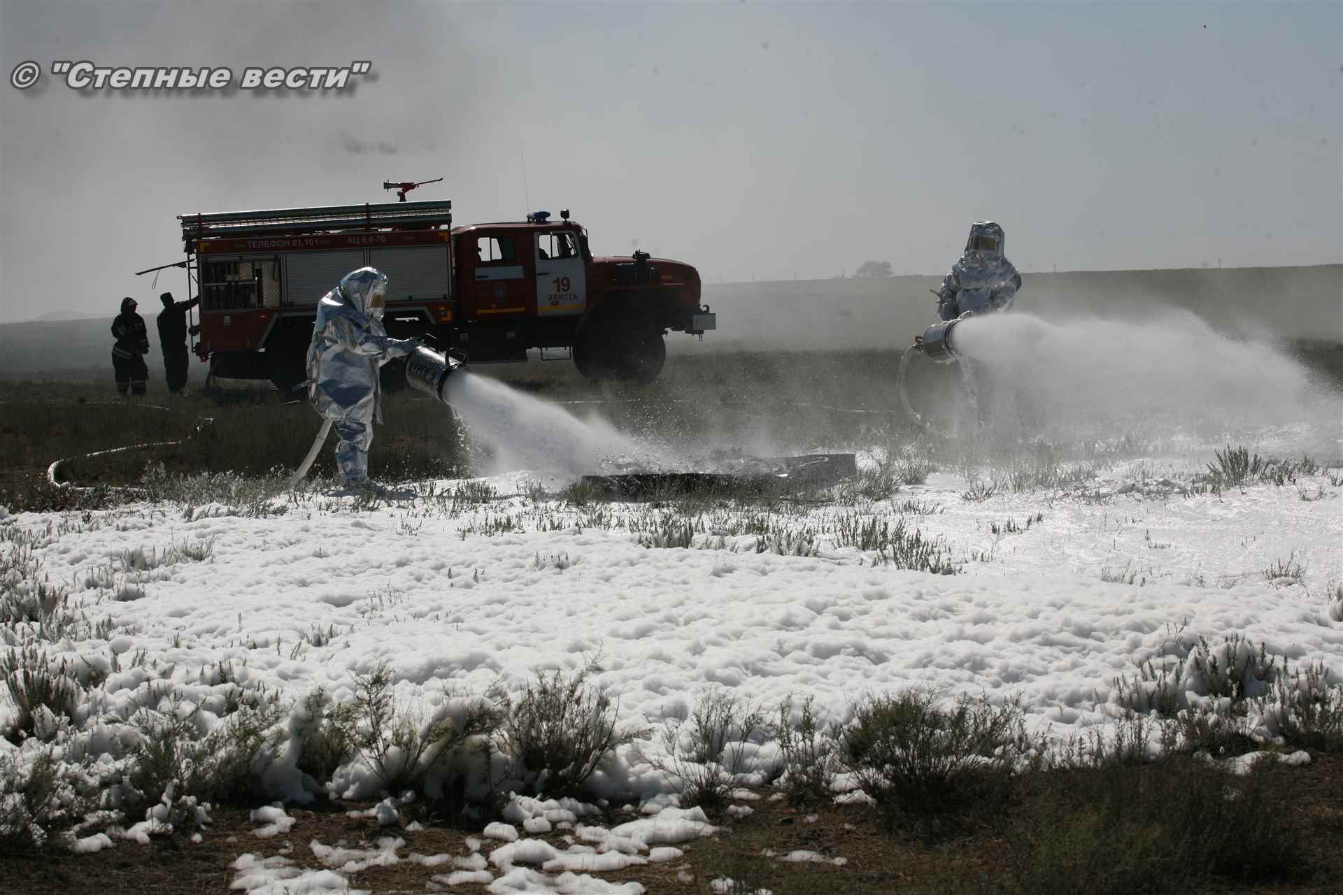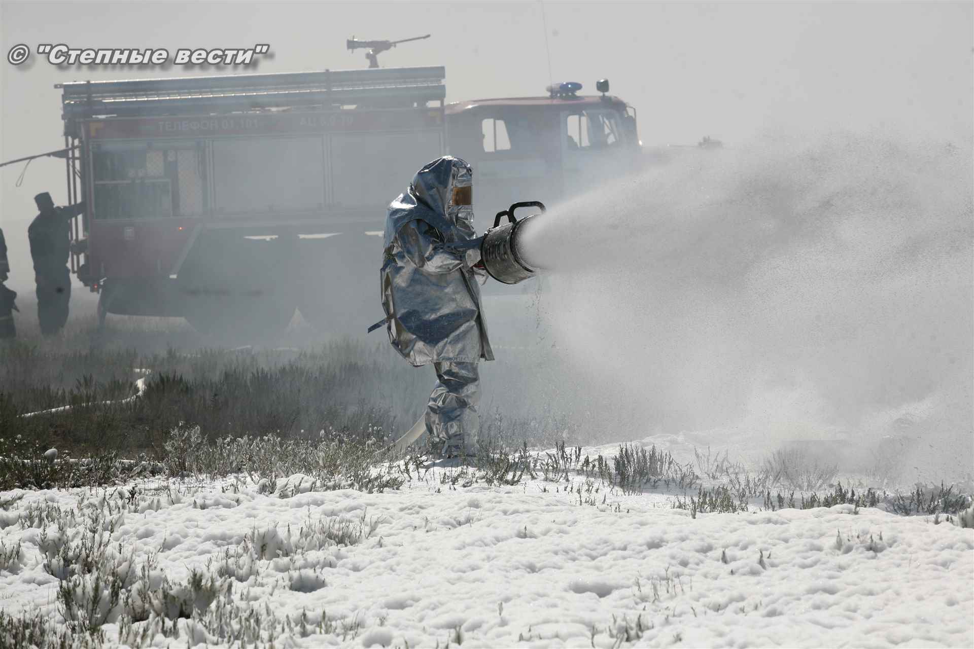 Учения развернулись в степи, близ реки Маныч. Здесь можно было насладиться ароматом полыни, посмотреть технику и оборудование, которые применяют во время подобных мероприятий, в том числе те же боновые заграждения, протянутые к водоему, и понаблюдать, как спасатели ловко тушат огонь с помощью пенной атаки. Зрелище получилось эффектное, в большей степени из-за контрастности: устрашающе-черный дым на фоне синего неба и белоснежная воздушно-механическая пена, полностью подавившая возгорание. Впечатлили и сами спасатели — в серебристой теплоотражательной одежде, предназначенной для защиты личного состава подразделений пожарной охраны от интенсивного теплового излучения, высоких температур окружающей среды и кратковременного контакта с открытым пламенем.