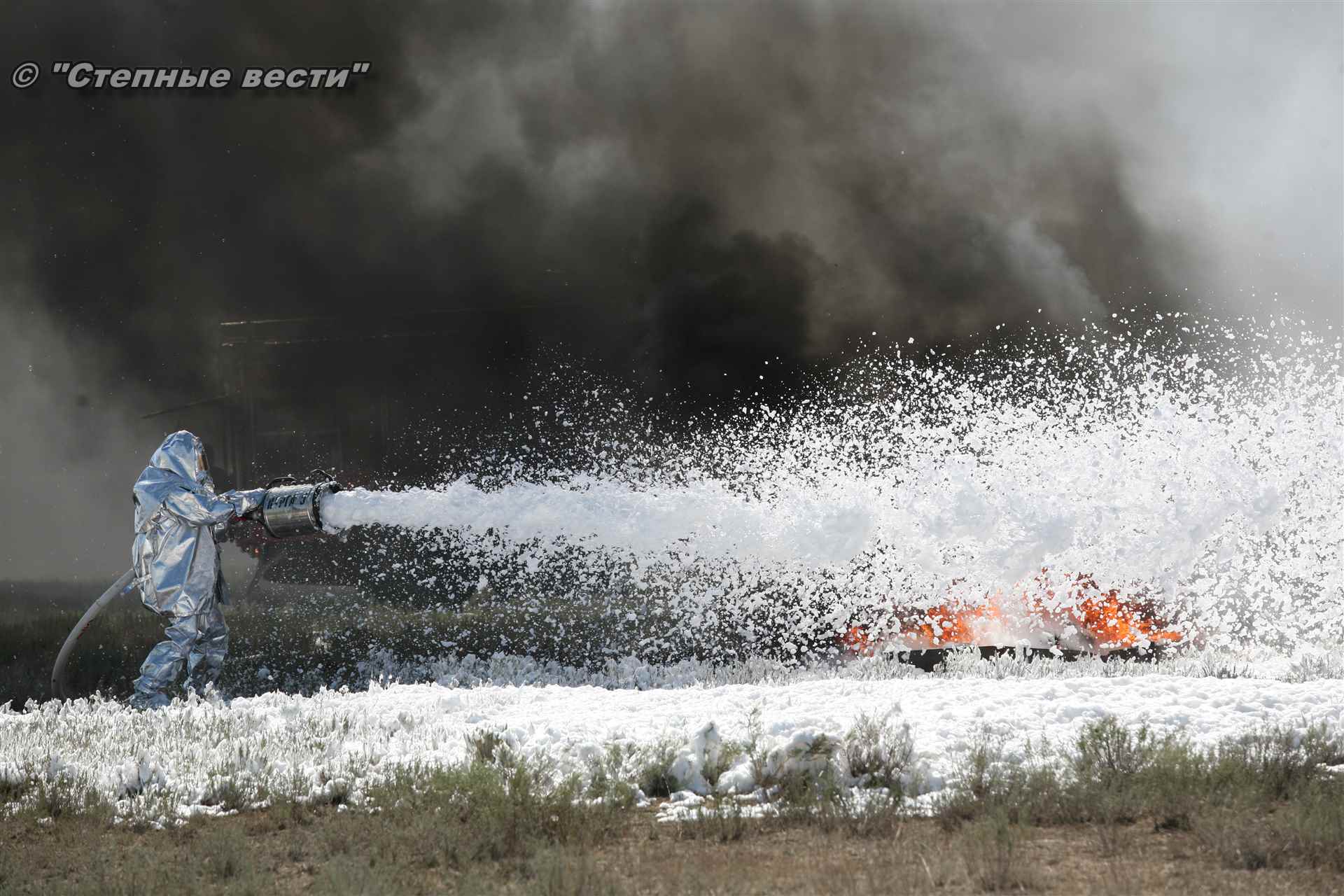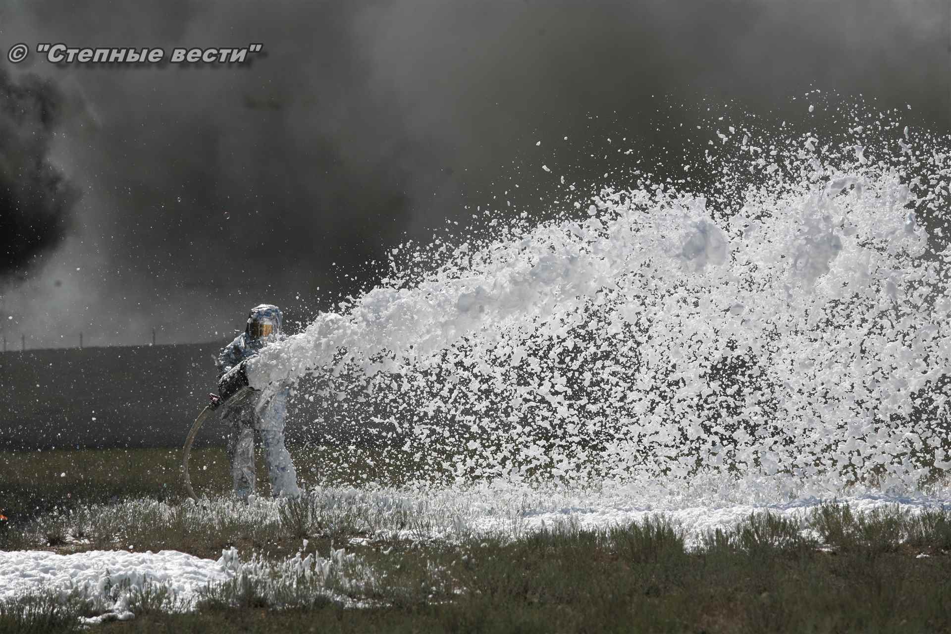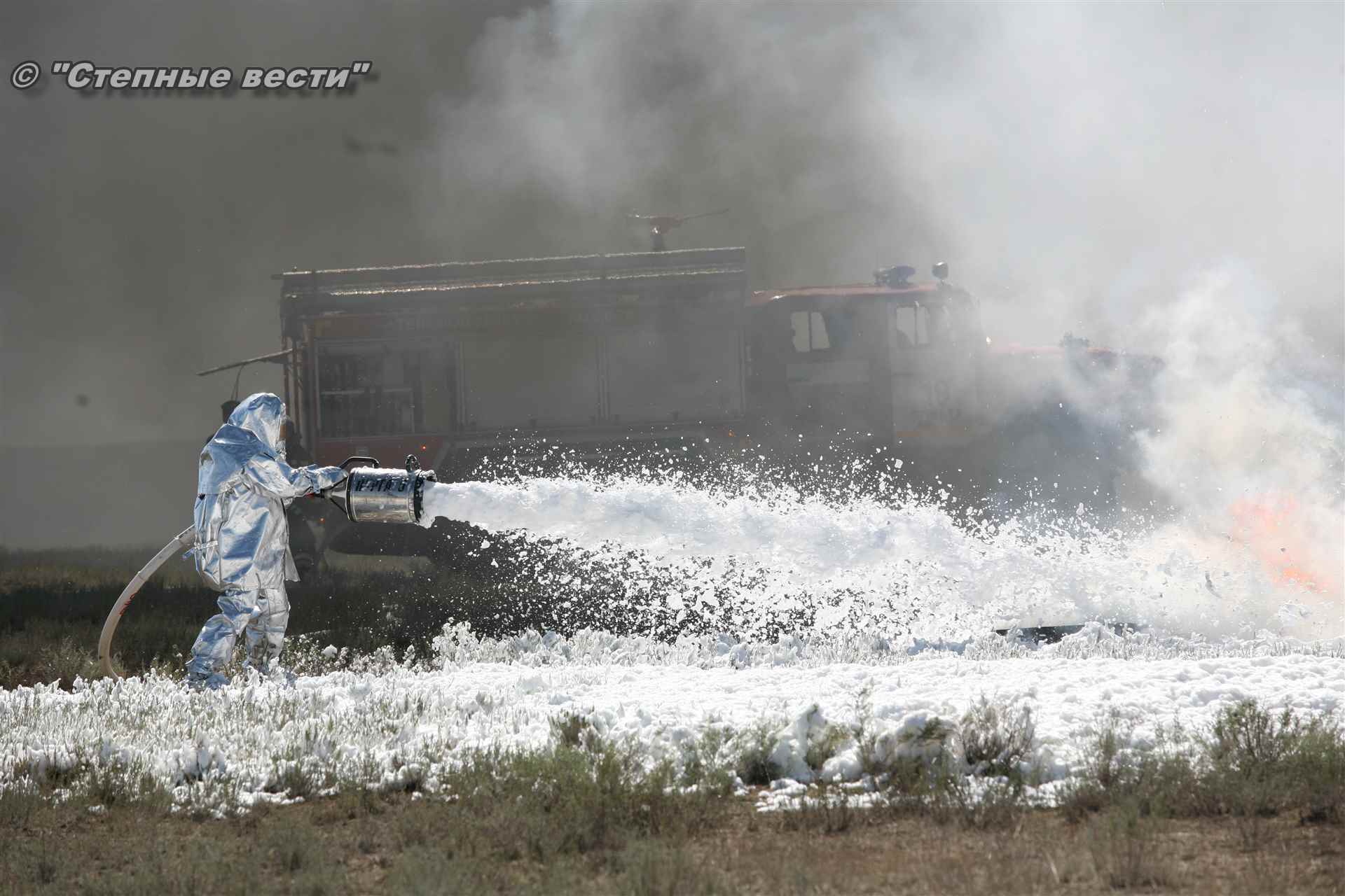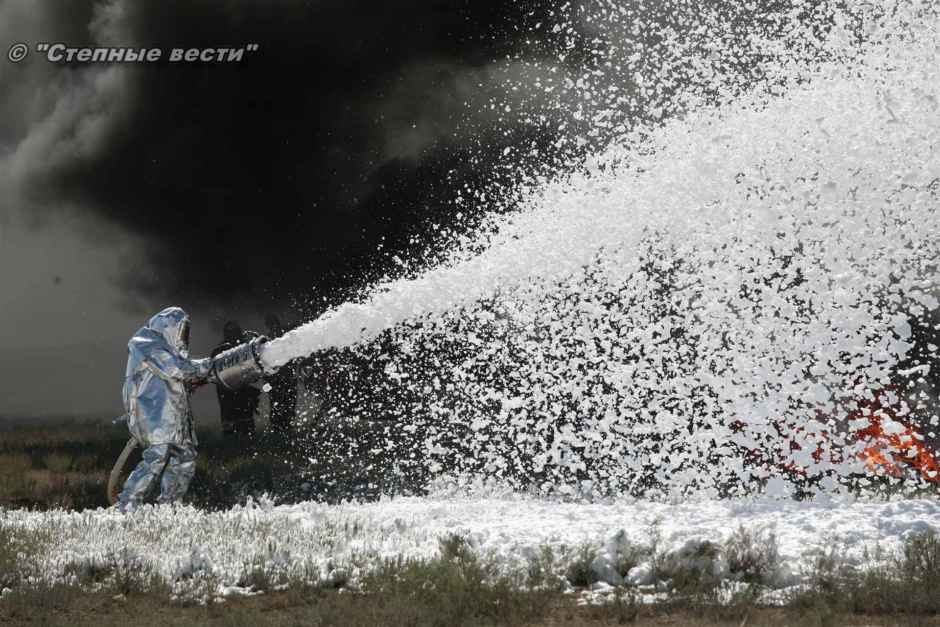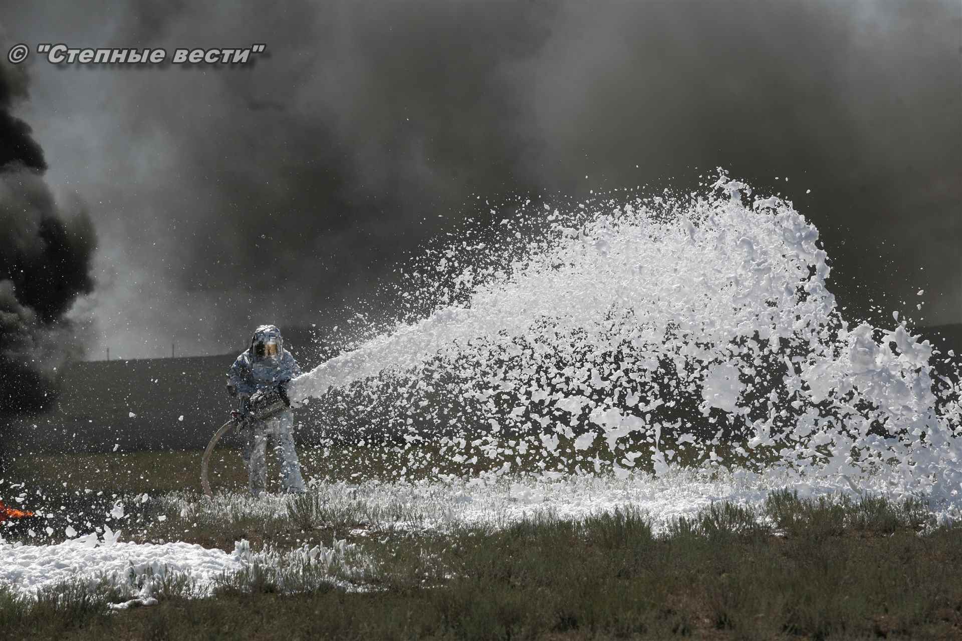 Учения развернулись в степи, близ реки Маныч. Здесь можно было насладиться ароматом полыни, посмотреть технику и оборудование, которые применяют во время подобных мероприятий, в том числе те же боновые заграждения, протянутые к водоему, и понаблюдать, как спасатели ловко тушат огонь с помощью пенной атаки. Зрелище получилось эффектное, в большей степени из-за контрастности: устрашающе-черный дым на фоне синего неба и белоснежная воздушно-механическая пена, полностью подавившая возгорание. Впечатлили и сами спасатели — в серебристой теплоотражательной одежде, предназначенной для защиты личного состава подразделений пожарной охраны от интенсивного теплового излучения, высоких температур окружающей среды и кратковременного контакта с открытым пламенем.