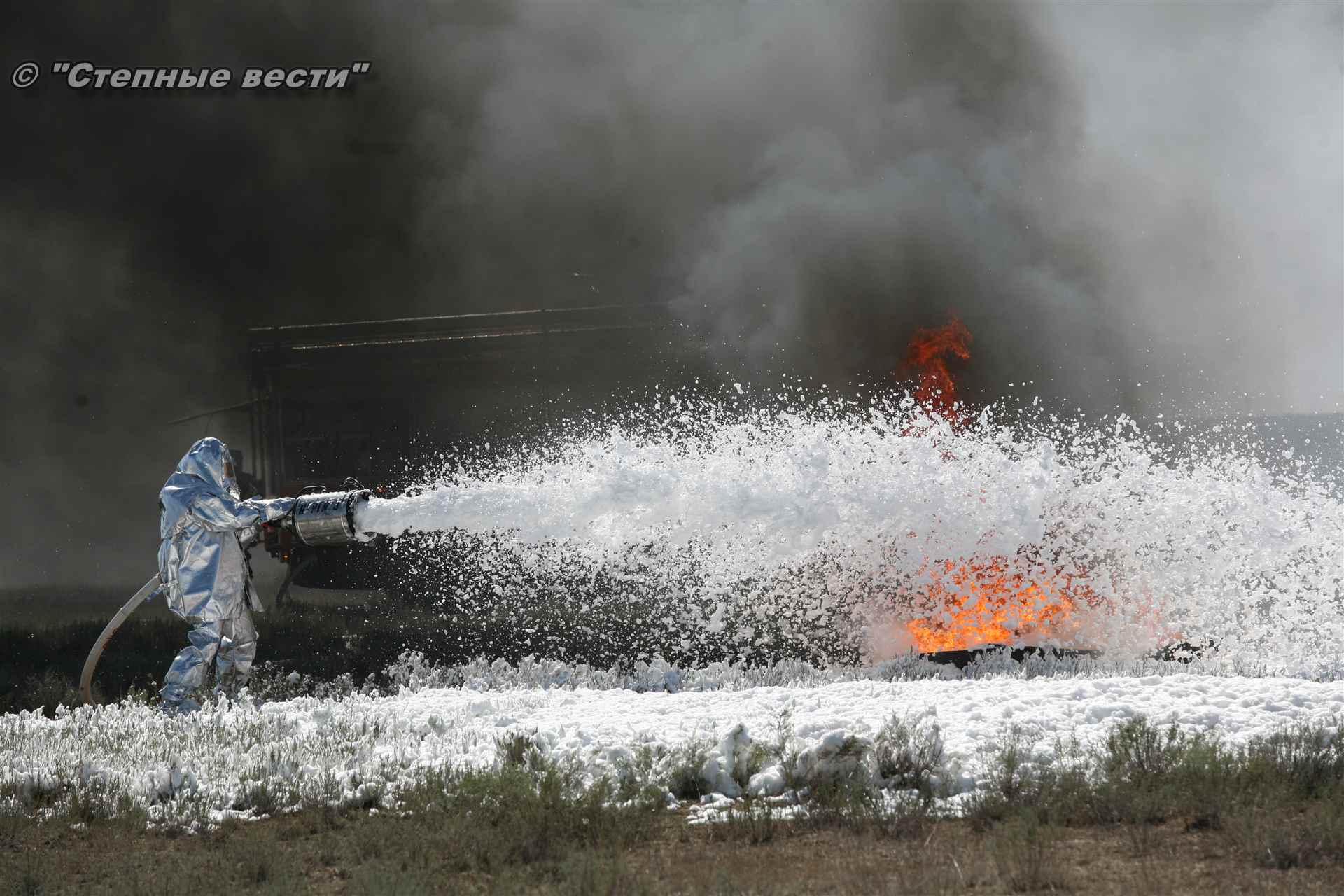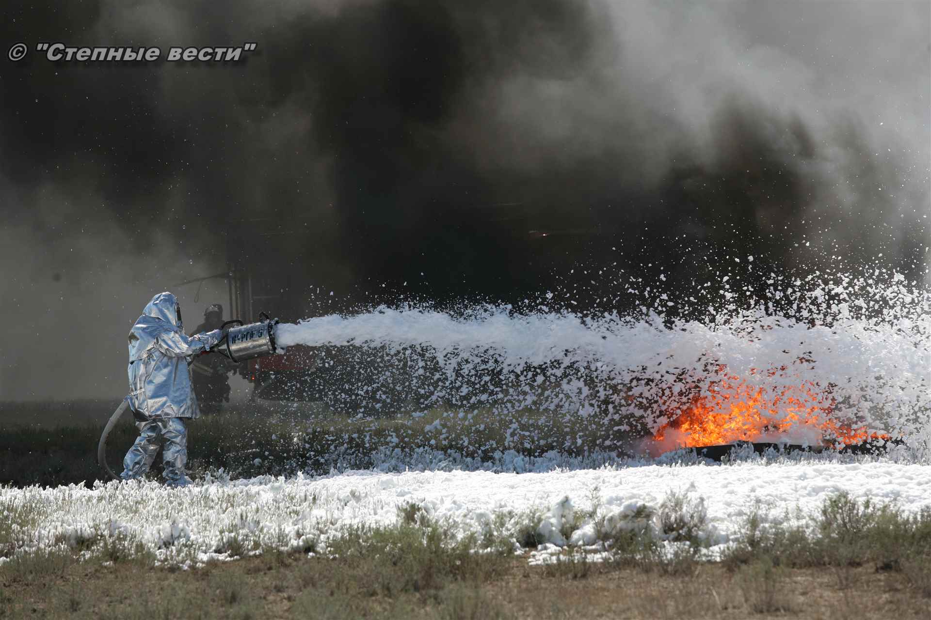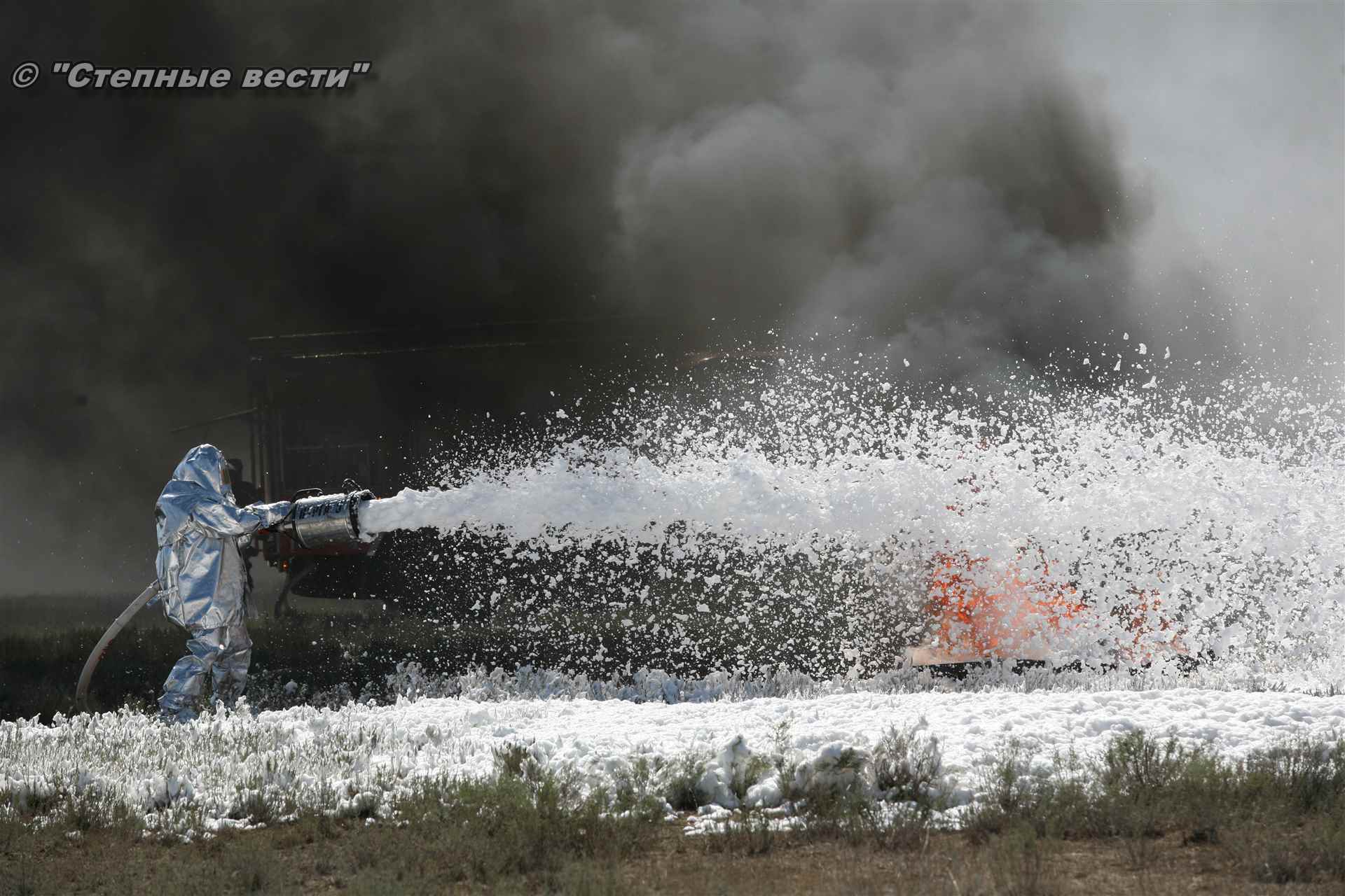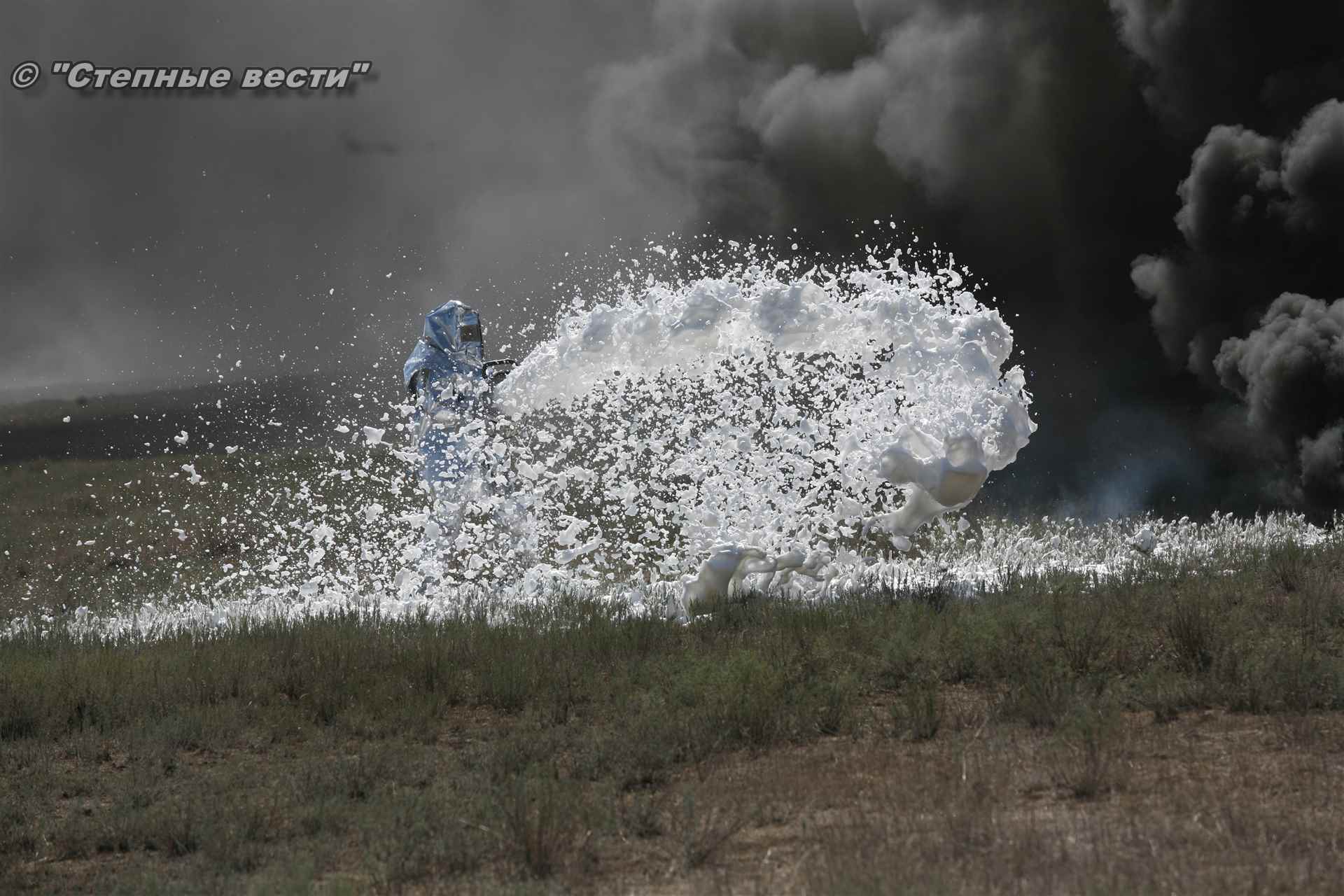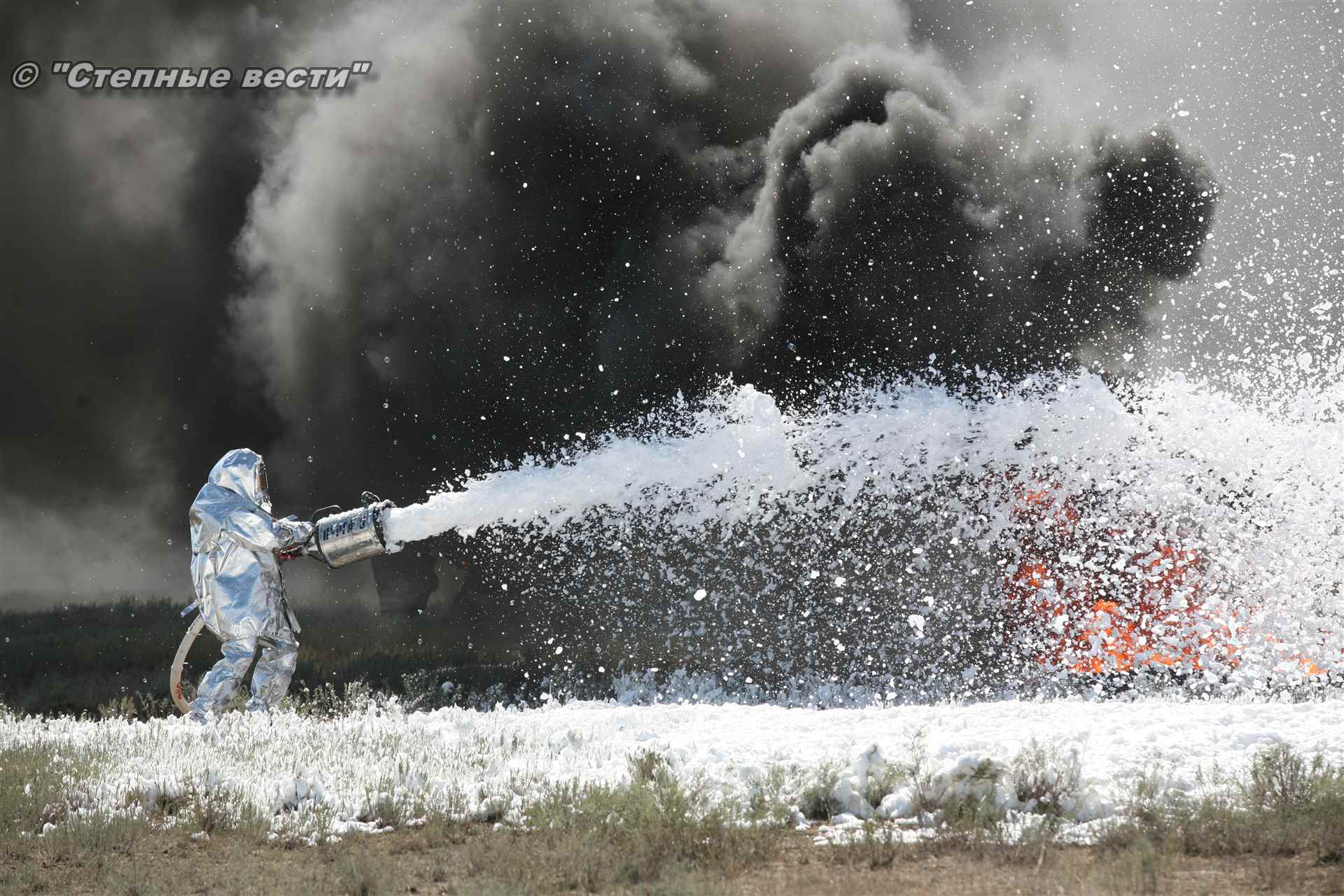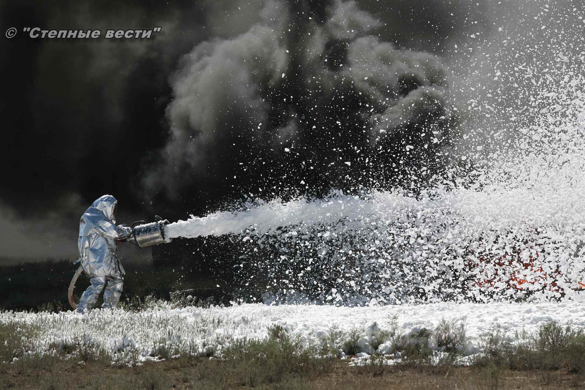 Учения развернулись в степи, близ реки Маныч. Здесь можно было насладиться ароматом полыни, посмотреть технику и оборудование, которые применяют во время подобных мероприятий, в том числе те же боновые заграждения, протянутые к водоему, и понаблюдать, как спасатели ловко тушат огонь с помощью пенной атаки. Зрелище получилось эффектное, в большей степени из-за контрастности: устрашающе-черный дым на фоне синего неба и белоснежная воздушно-механическая пена, полностью подавившая возгорание. Впечатлили и сами спасатели — в серебристой теплоотражательной одежде, предназначенной для защиты личного состава подразделений пожарной охраны от интенсивного теплового излучения, высоких температур окружающей среды и кратковременного контакта с открытым пламенем.