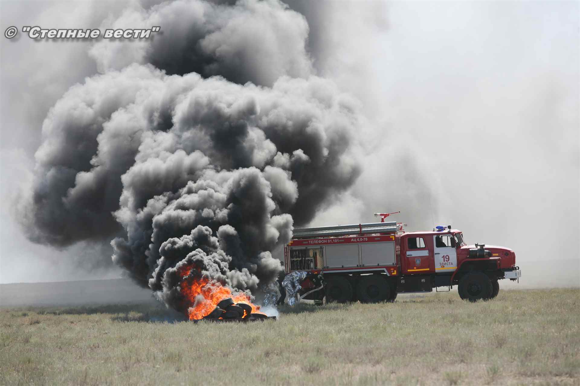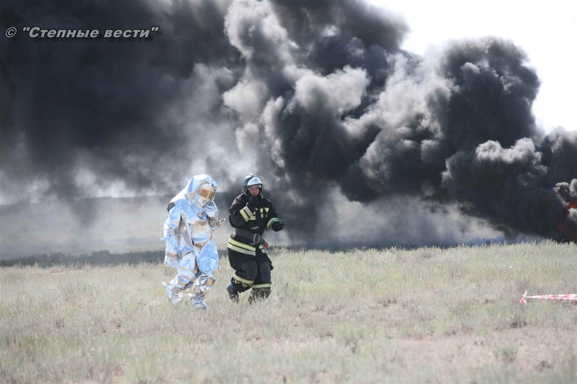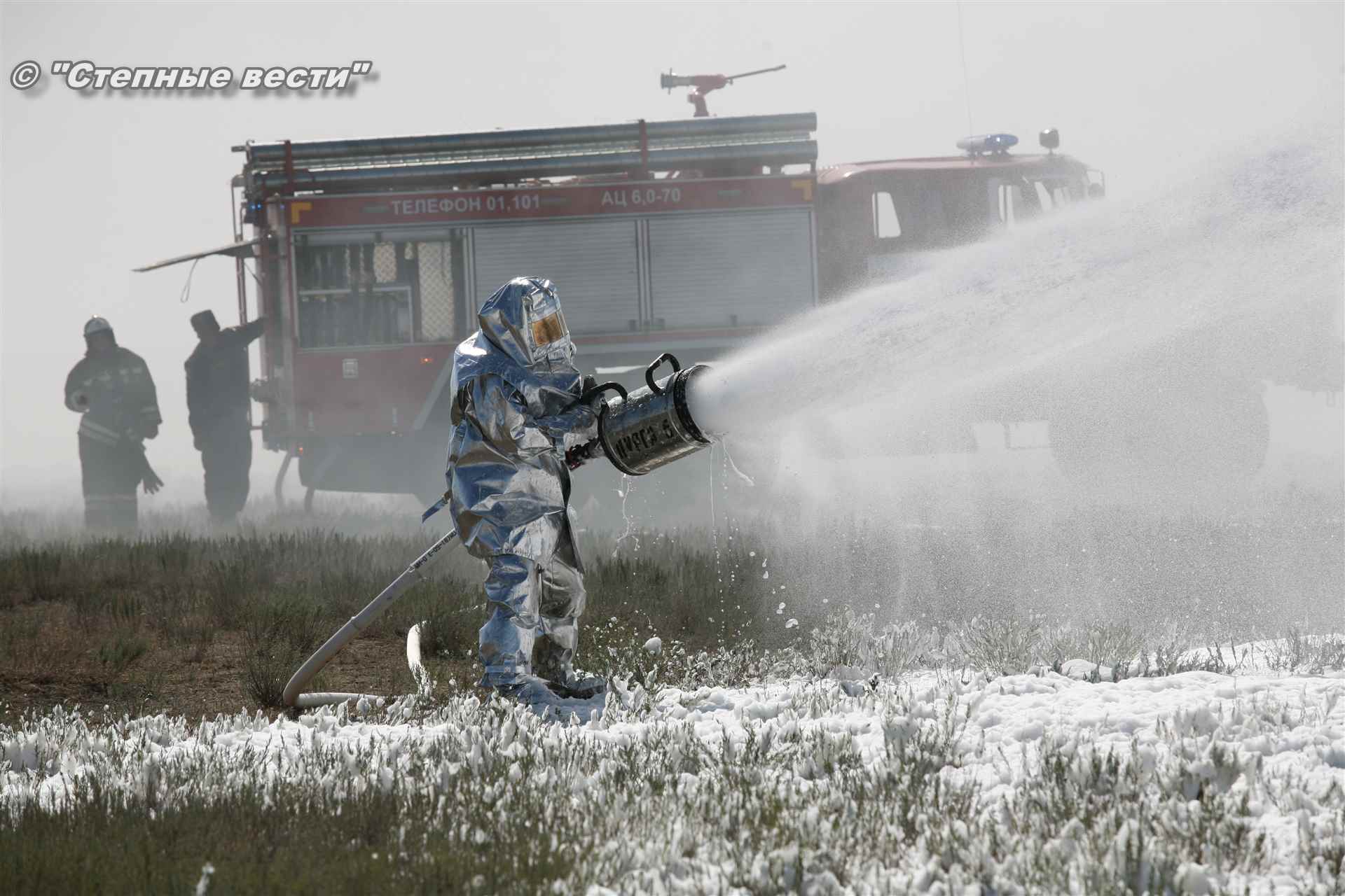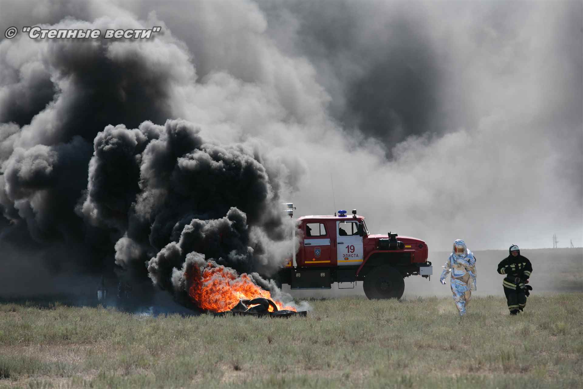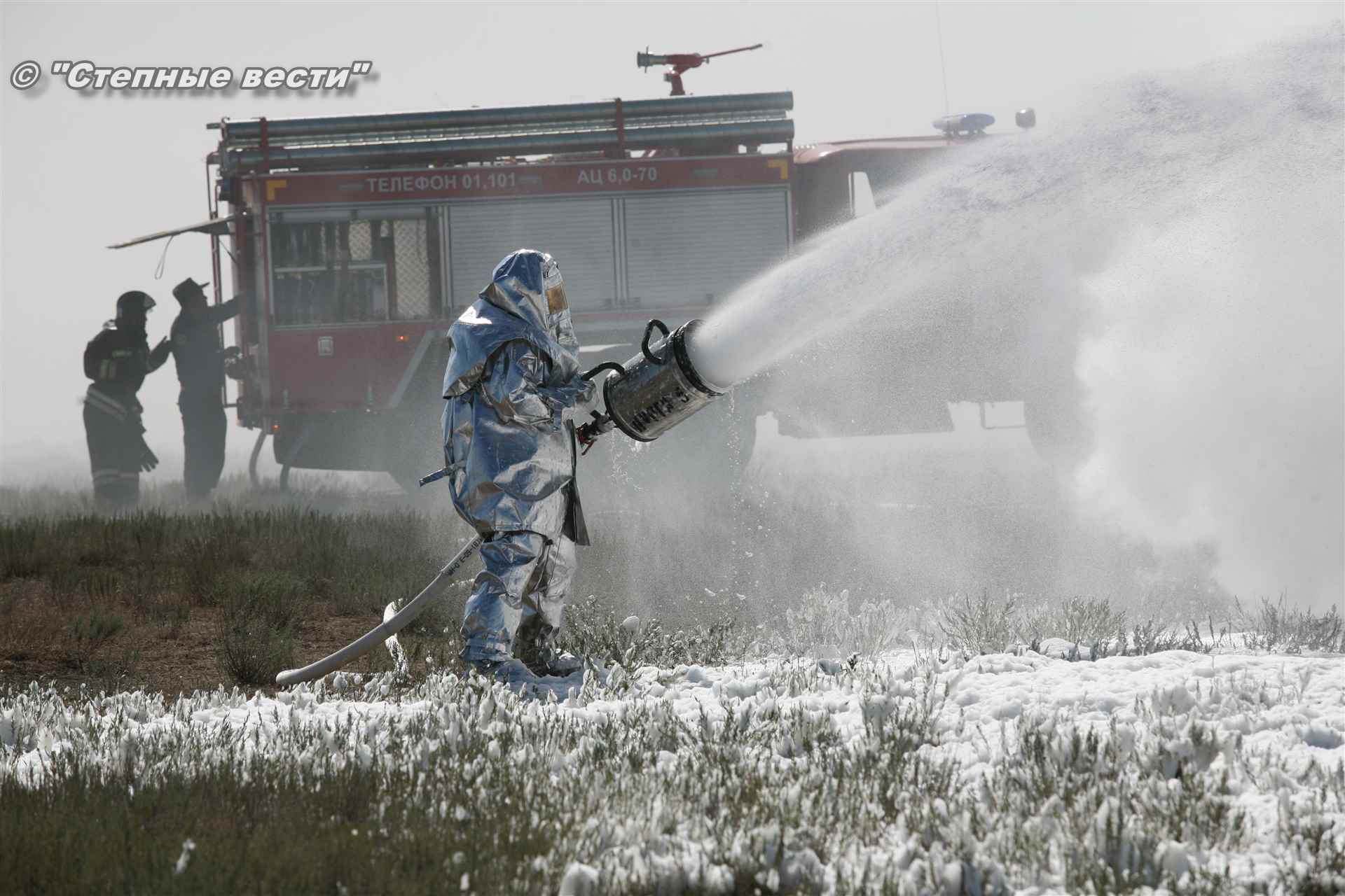 Учения развернулись в степи, близ реки Маныч. Здесь можно было насладиться ароматом полыни, посмотреть технику и оборудование, которые применяют во время подобных мероприятий, в том числе те же боновые заграждения, протянутые к водоему, и понаблюдать, как спасатели ловко тушат огонь с помощью пенной атаки. Зрелище получилось эффектное, в большей степени из-за контрастности: устрашающе-черный дым на фоне синего неба и белоснежная воздушно-механическая пена, полностью подавившая возгорание. Впечатлили и сами спасатели — в серебристой теплоотражательной одежде, предназначенной для защиты личного состава подразделений пожарной охраны от интенсивного теплового излучения, высоких температур окружающей среды и кратковременного контакта с открытым пламенем.