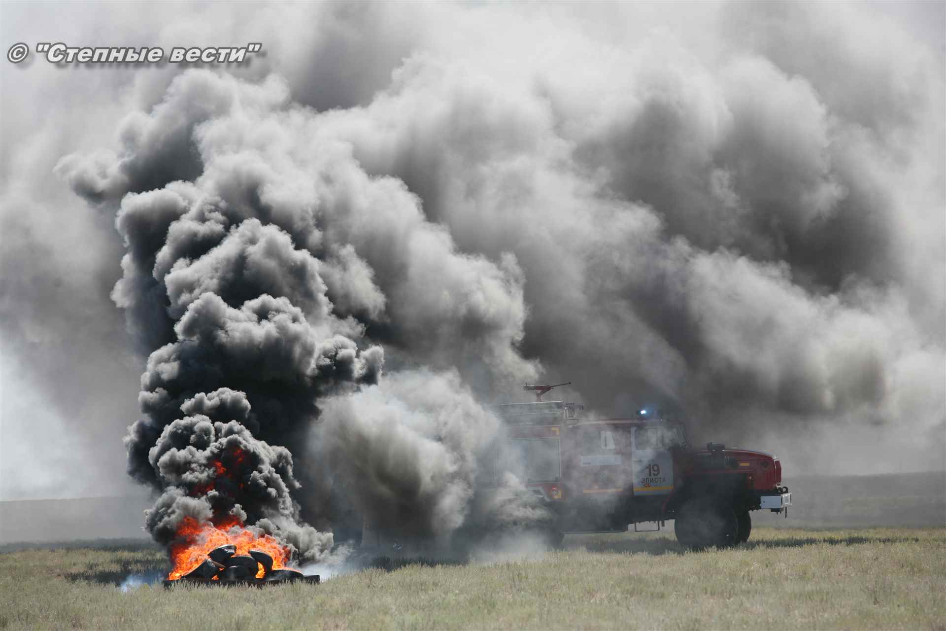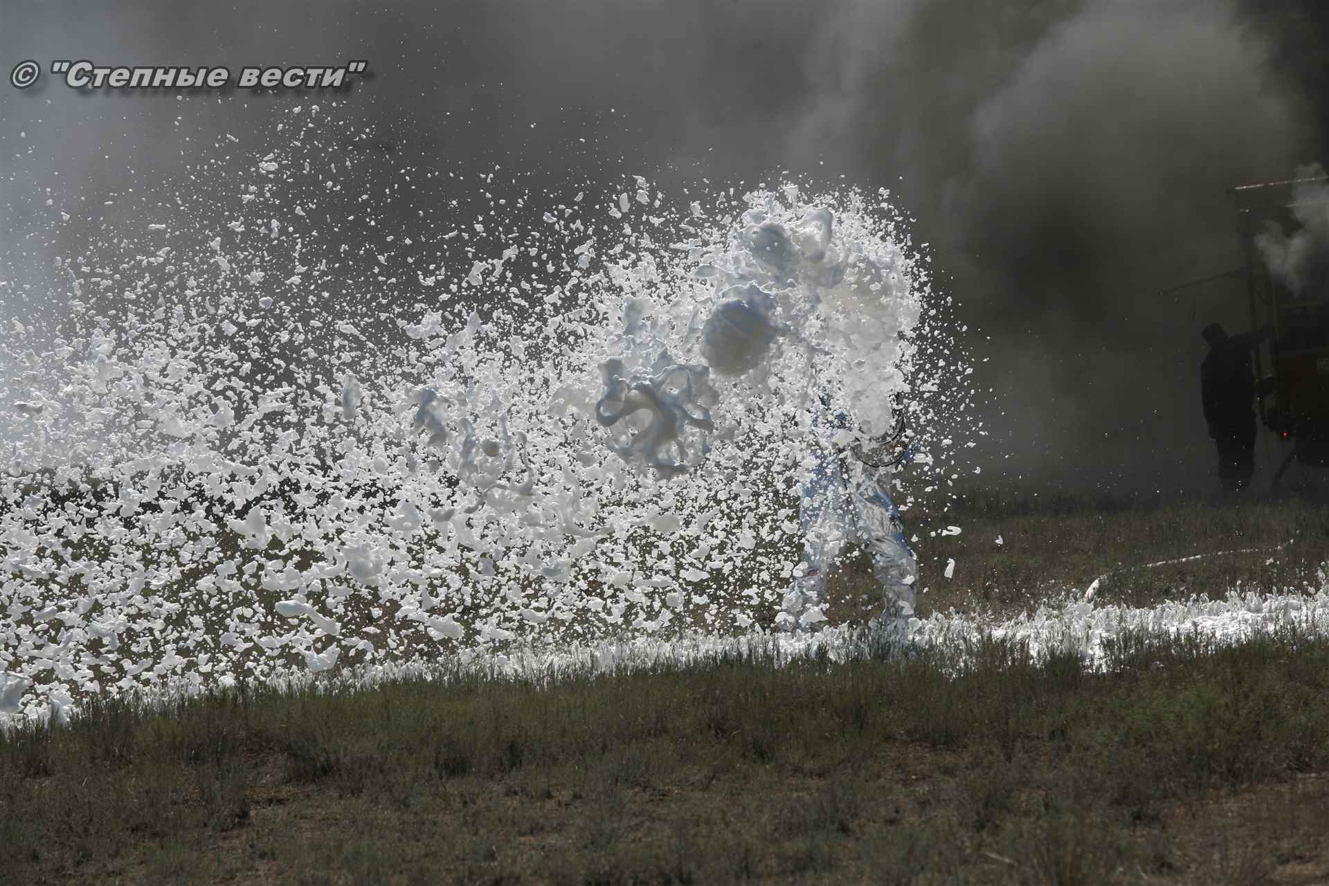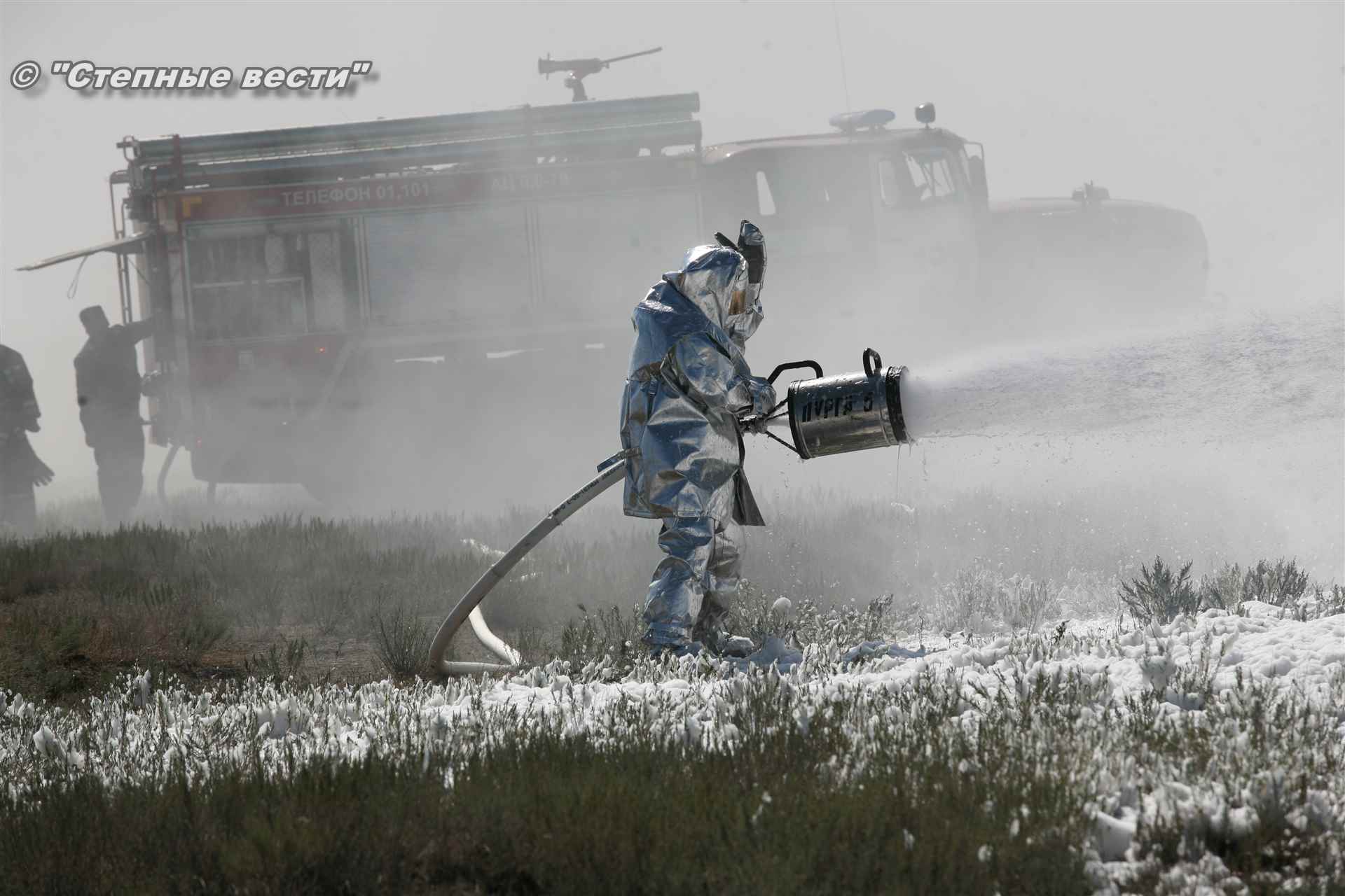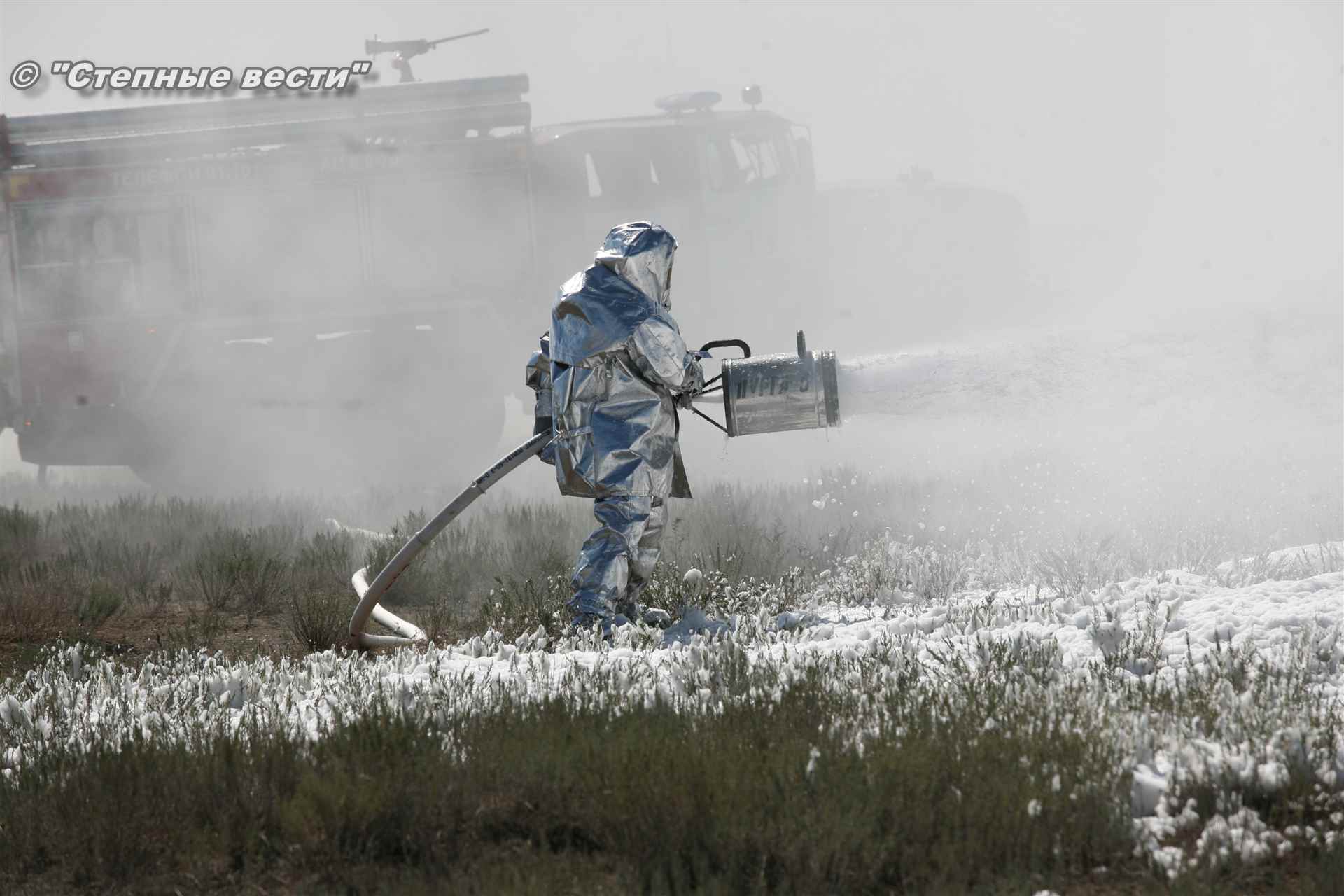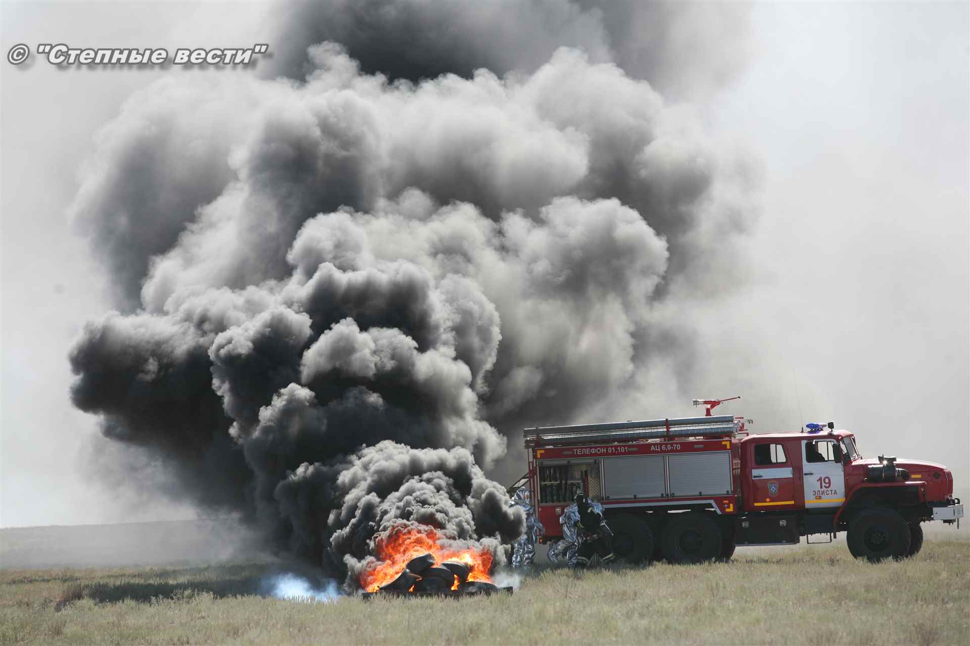 Учения развернулись в степи, близ реки Маныч. Здесь можно было насладиться ароматом полыни, посмотреть технику и оборудование, которые применяют во время подобных мероприятий, в том числе те же боновые заграждения, протянутые к водоему, и понаблюдать, как спасатели ловко тушат огонь с помощью пенной атаки. Зрелище получилось эффектное, в большей степени из-за контрастности: устрашающе-черный дым на фоне синего неба и белоснежная воздушно-механическая пена, полностью подавившая возгорание. Впечатлили и сами спасатели — в серебристой теплоотражательной одежде, предназначенной для защиты личного состава подразделений пожарной охраны от интенсивного теплового излучения, высоких температур окружающей среды и кратковременного контакта с открытым пламенем.