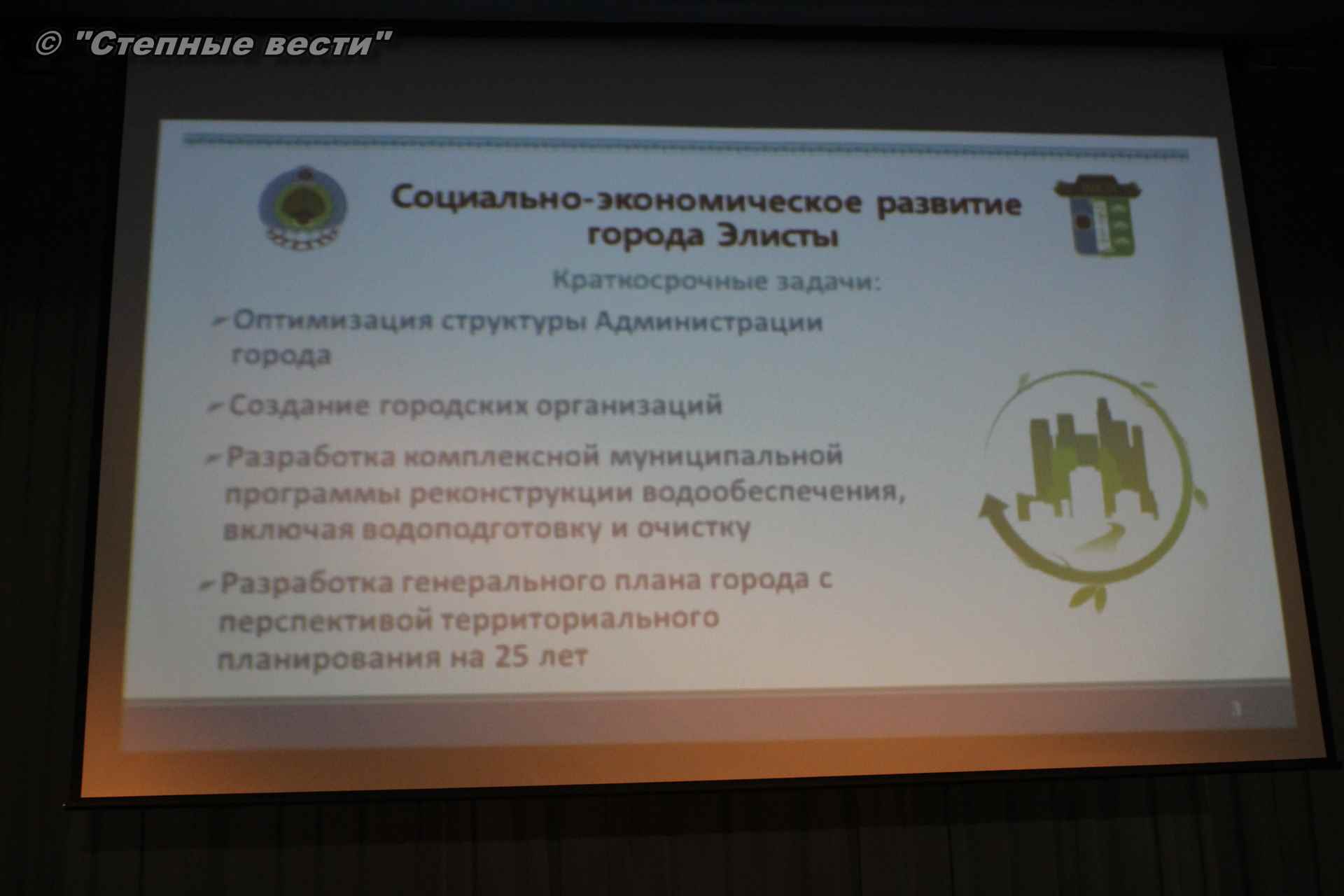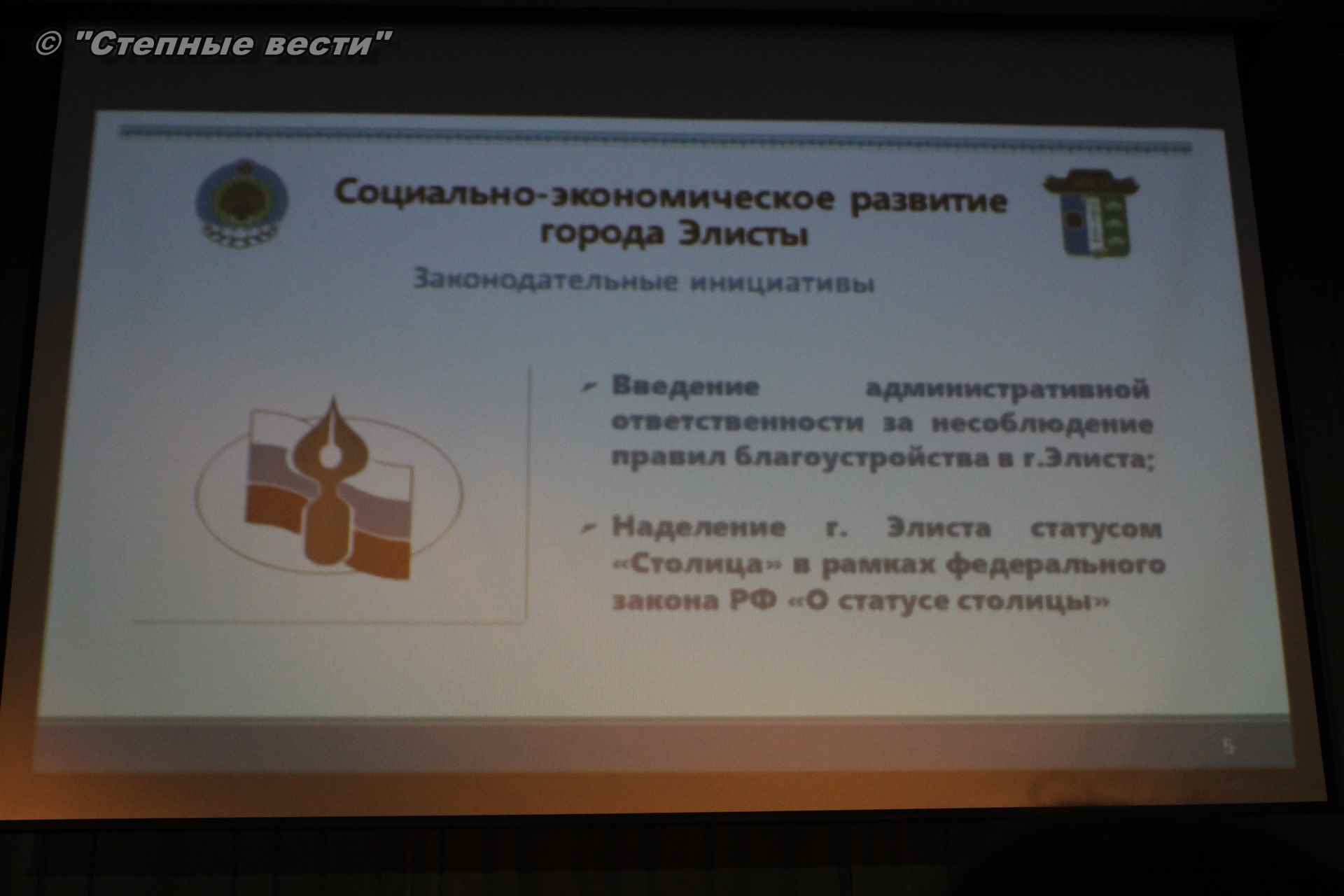 В своем выступлении и. о. главы города обозначил основные приоритеты в деятельности администрации Элисты. В частности, в плане организационной работы городских исполнительной и представительной ветвей власти поднят вопрос о наделении Элисты статусом столицы региона уже официально в рамках федерального закона «О статусе столицы Российской Федерации».