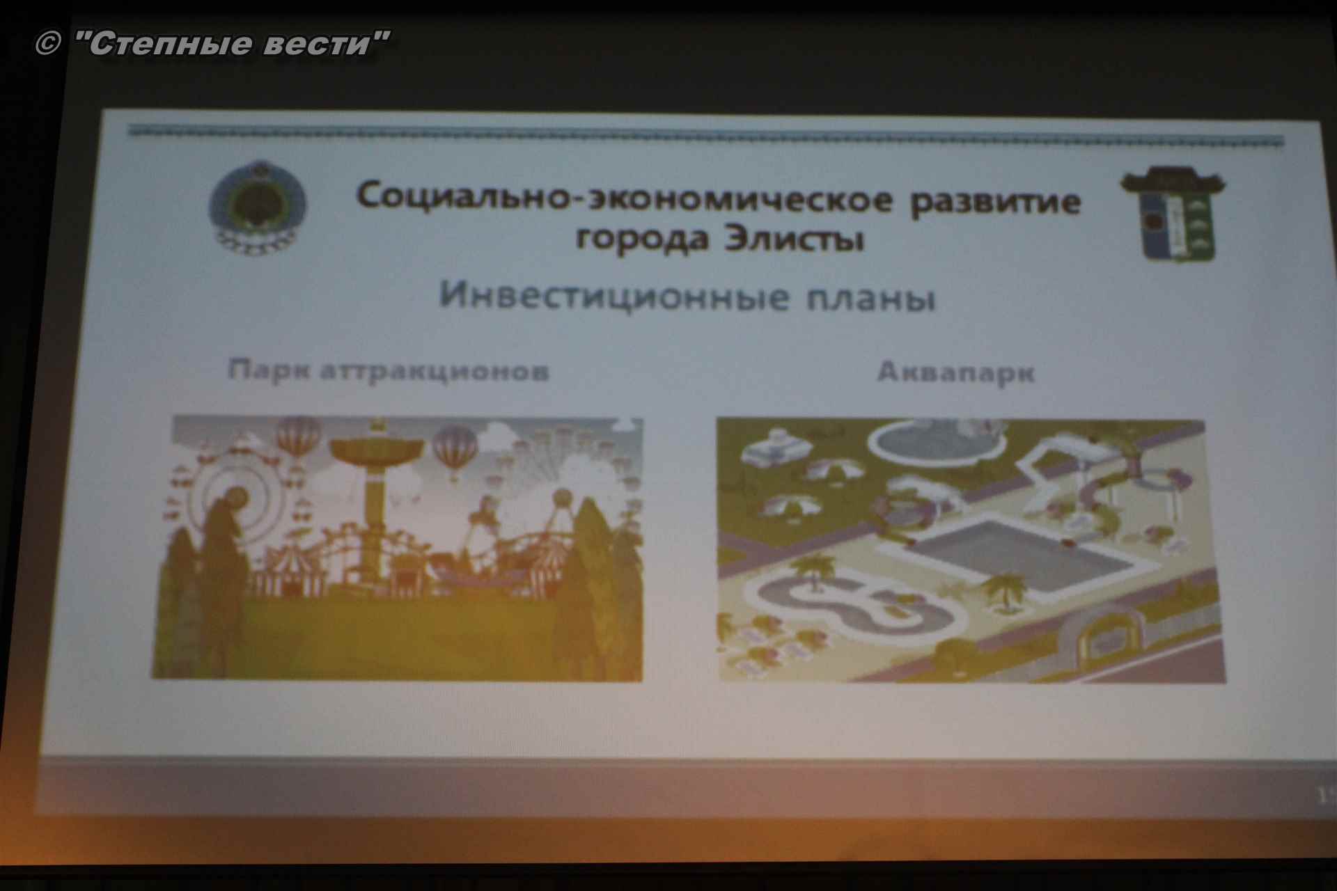 Также и. о. главы города Элисты презентовал инвестиционные проекты, которые планируется реализовать в Элисте. В частности, в настоящее время рассматриваются два перспективных проекта —  «Парк аттракционов» в парке «Дружба» и «Аквапарк» с круглогодичным режимом работы. В планах властей столичного муниципалитета – оживление строительного рынка в городе. Это касается как строительства жилья (будут построены четыре 22-этажных дома с коммерческими помещениями в цоколях), так и гражданского, промышленного строительства. В частности, частными инвесторами представлены проекты строительства предприятия по производству угольных фильтров бытового и промышленного применения и торгово-ярмарочного комплекса.