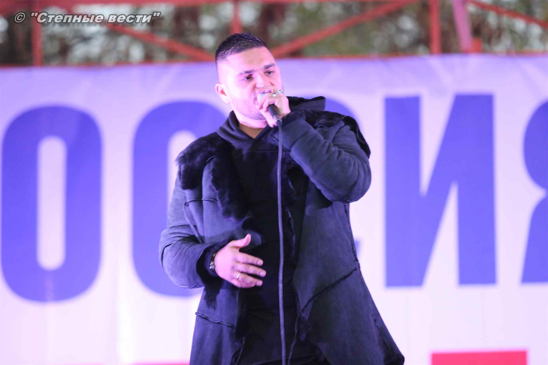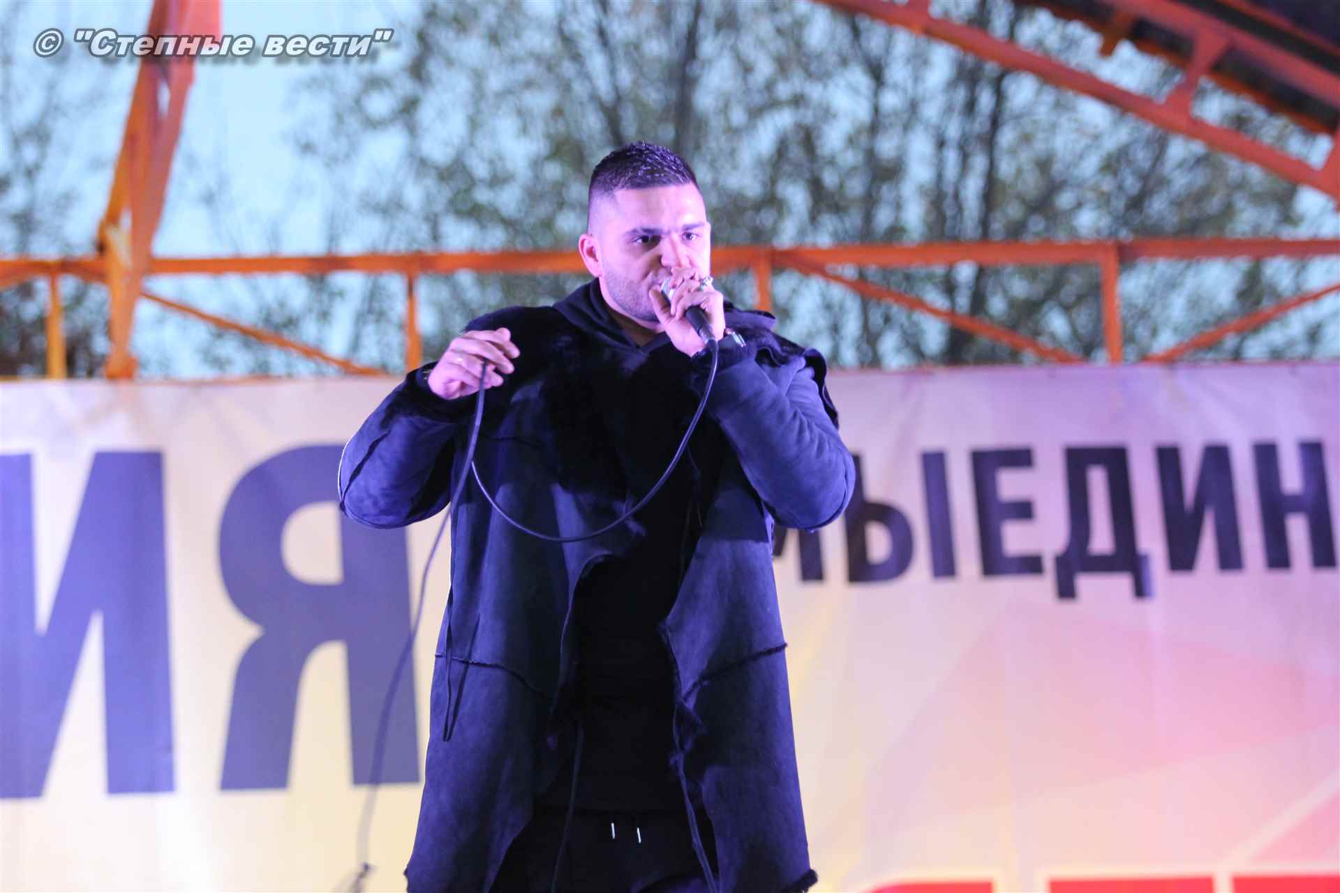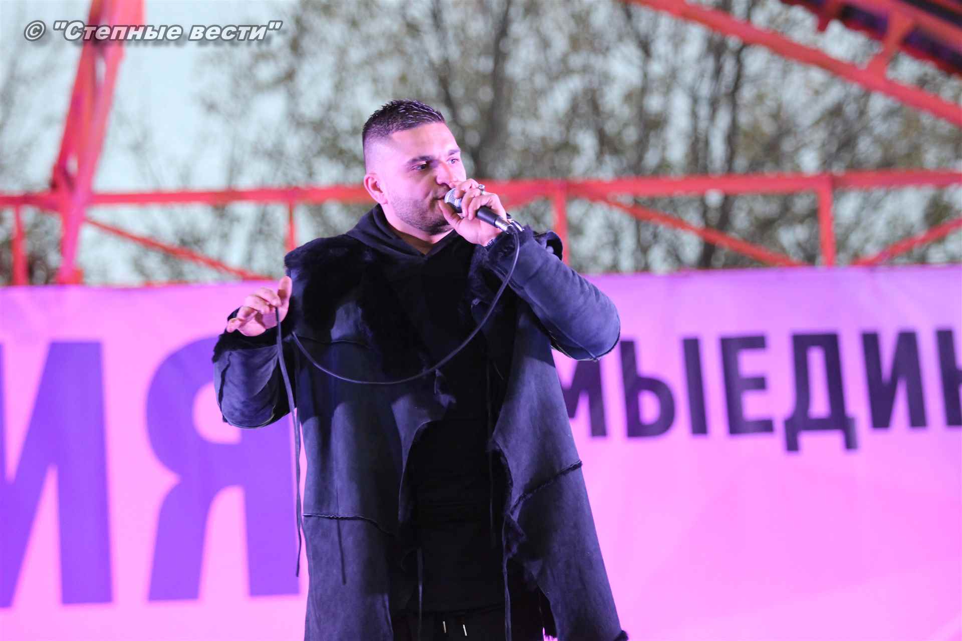 Почти до 16.00 час. на площади Победы перед жителями Элисты и гостями столицы выступали известные творческие коллективы и исполнители. А затем на сцене появились звезды российской эстрады – певец, поэт Батишта и рэп-исполнитель Dino MC 47.