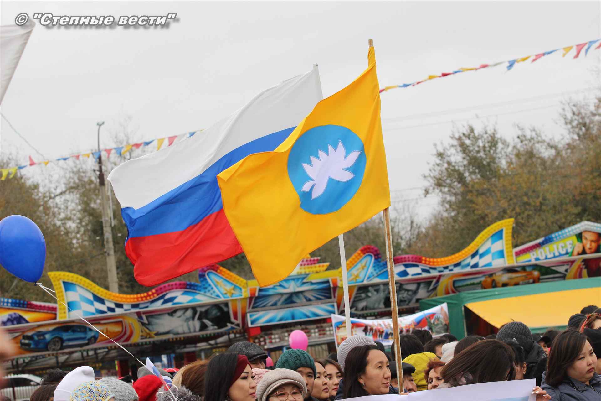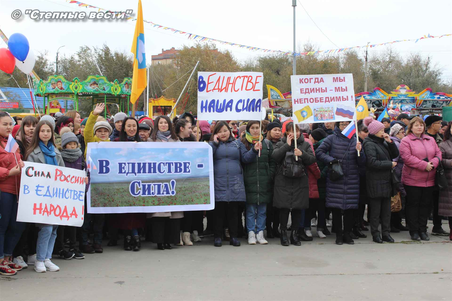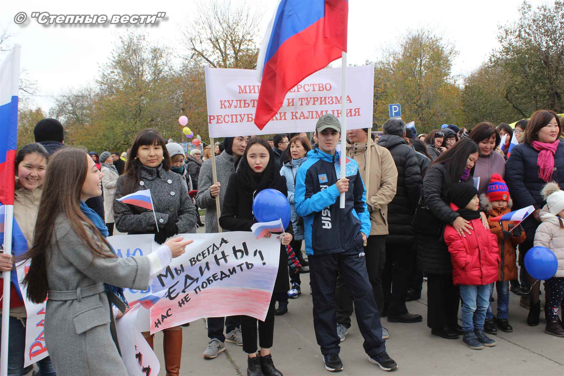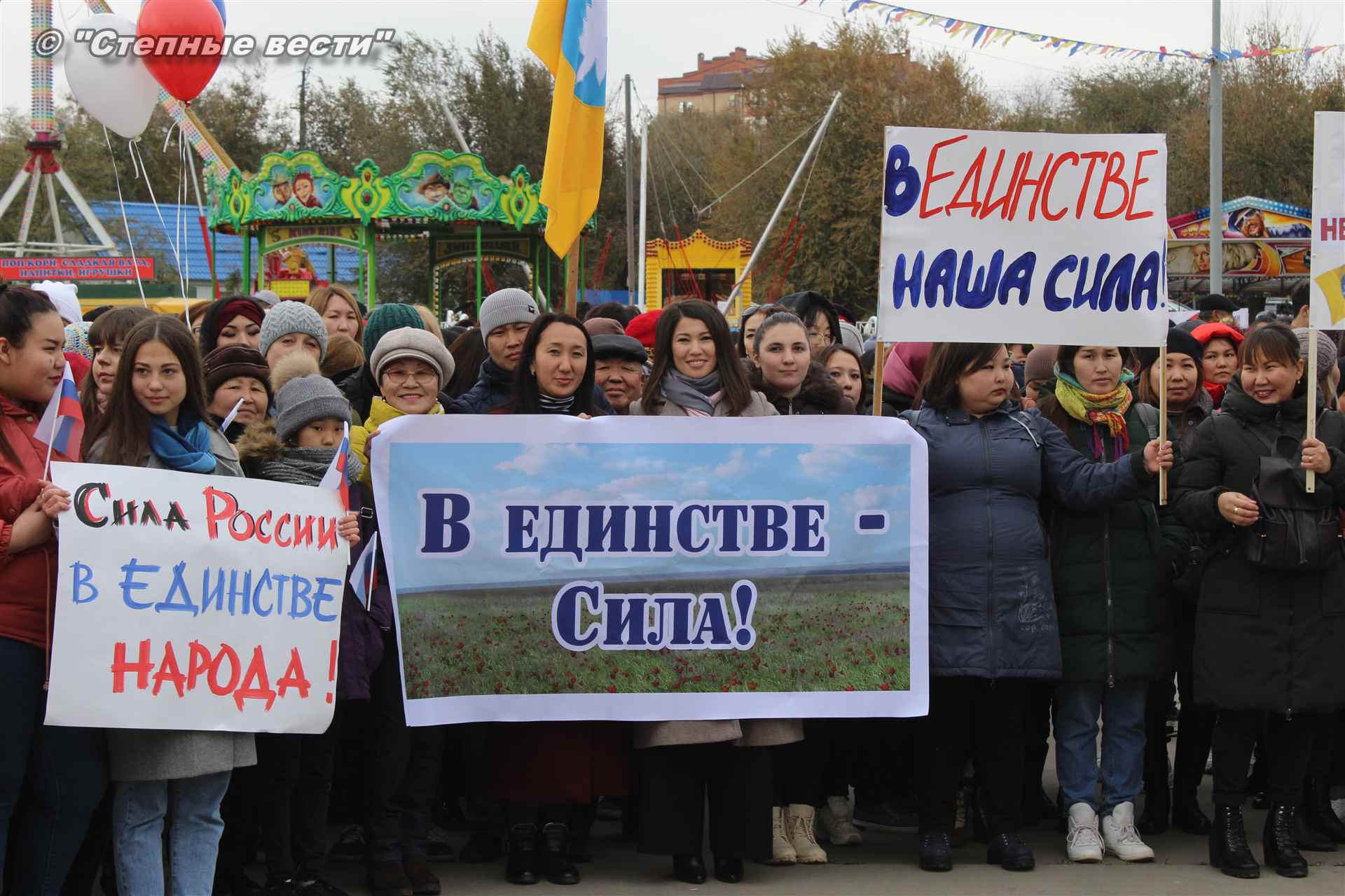 Люди разных возрастов держали в руках флажки, плакаты с надписями «В единстве наша сила», «Пока мы едины, мы непобедимы!» и другими. А юнармейцы развернули у сцены российский триколор и такой же большой флаг Калмыкии.