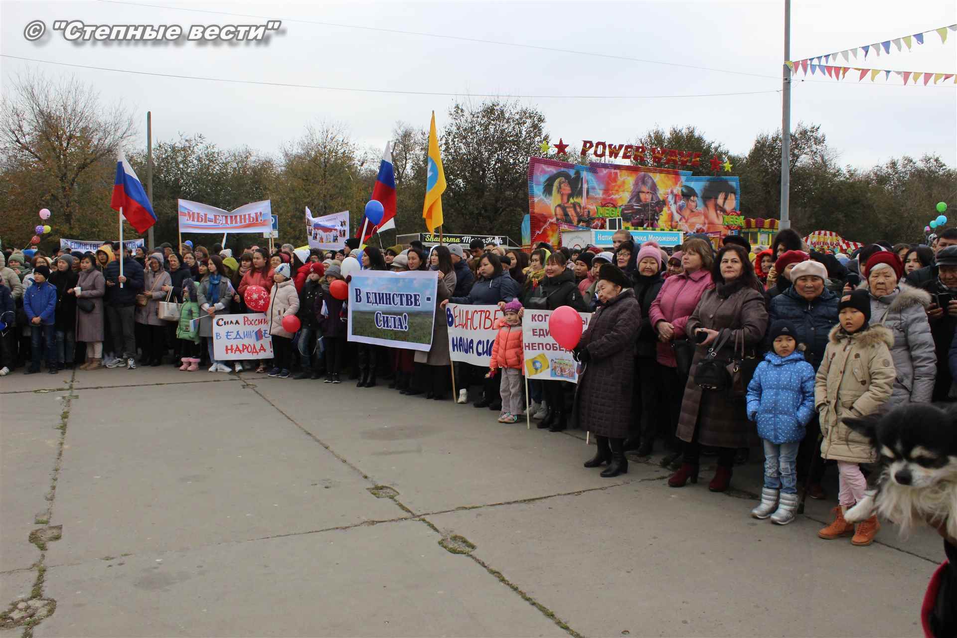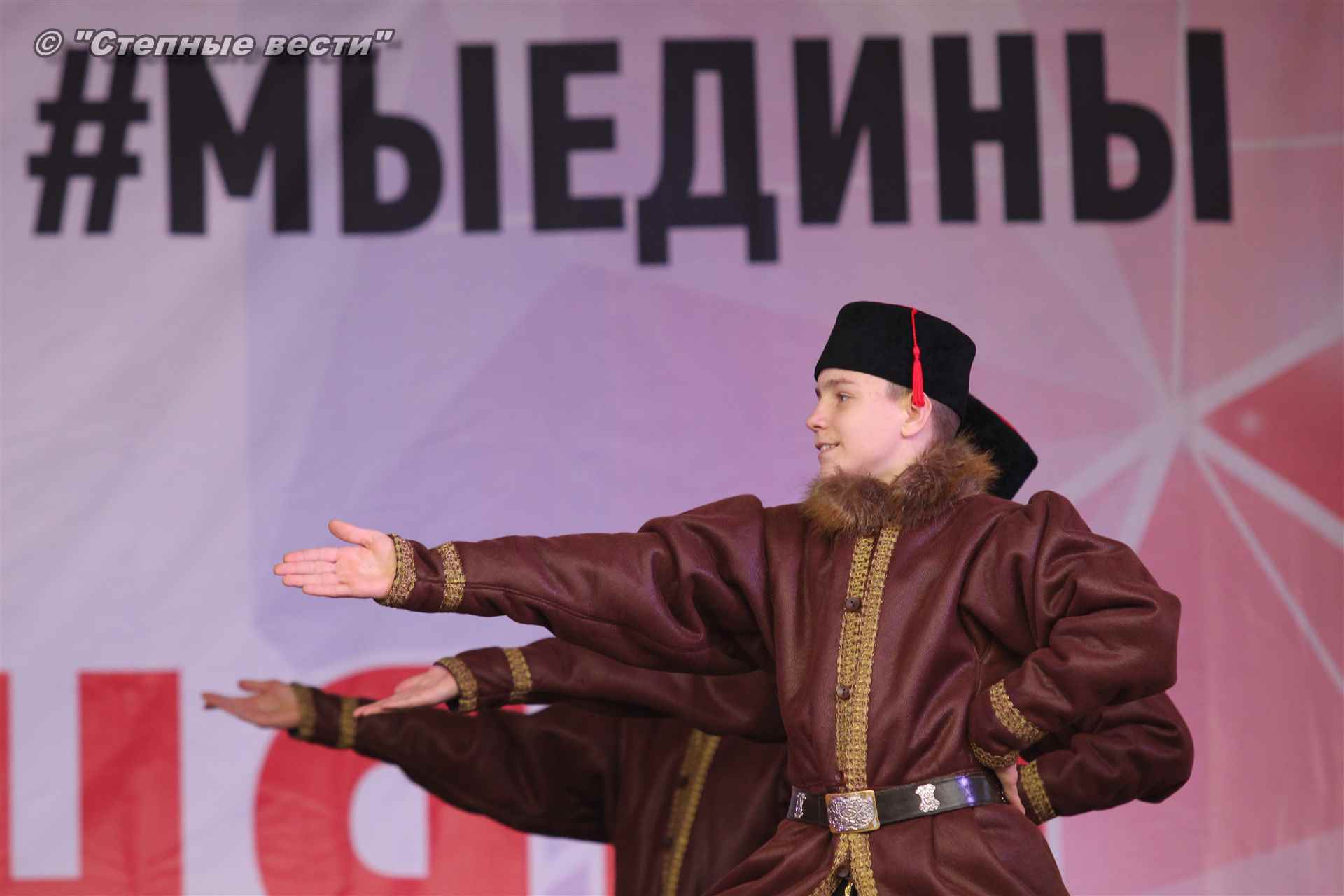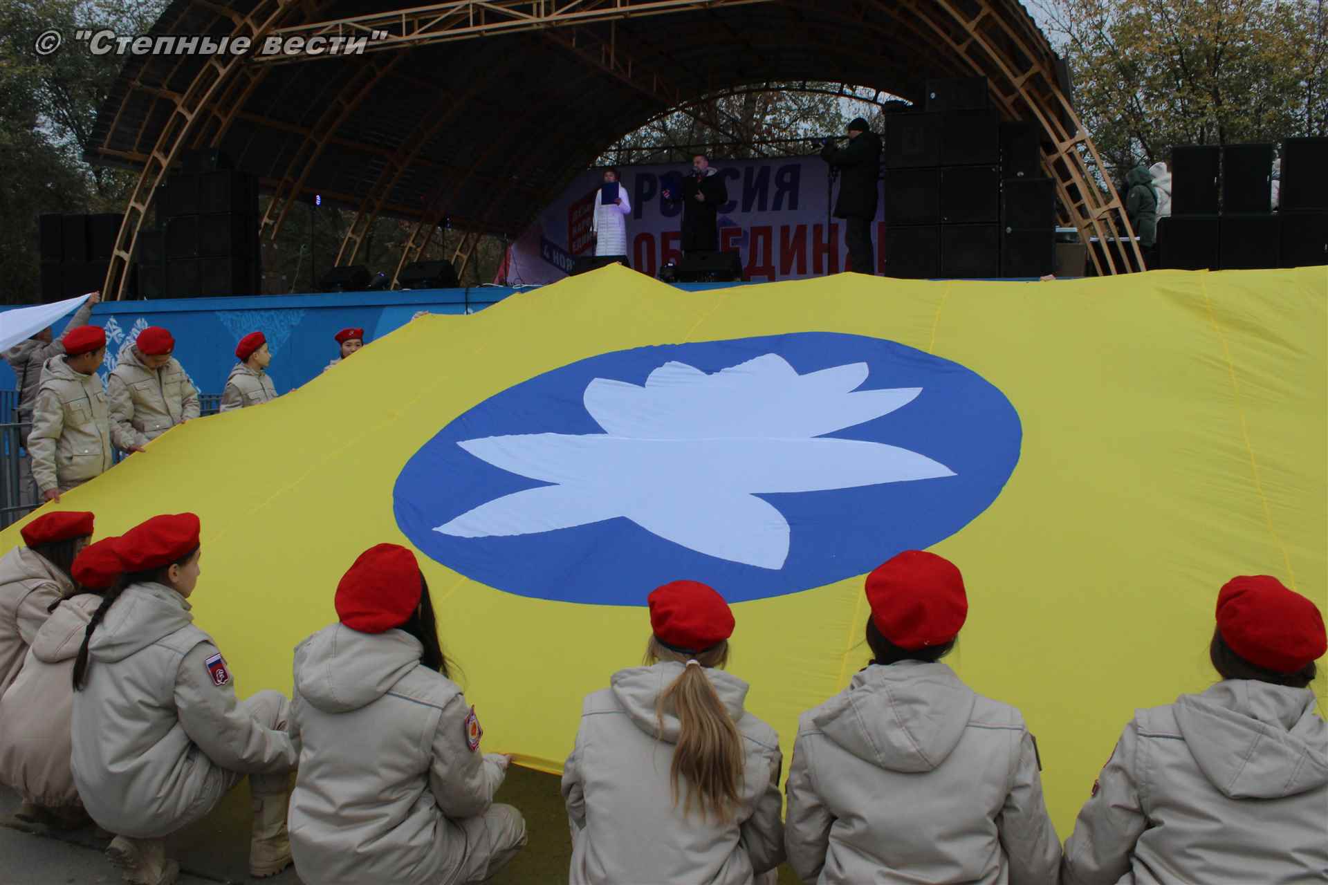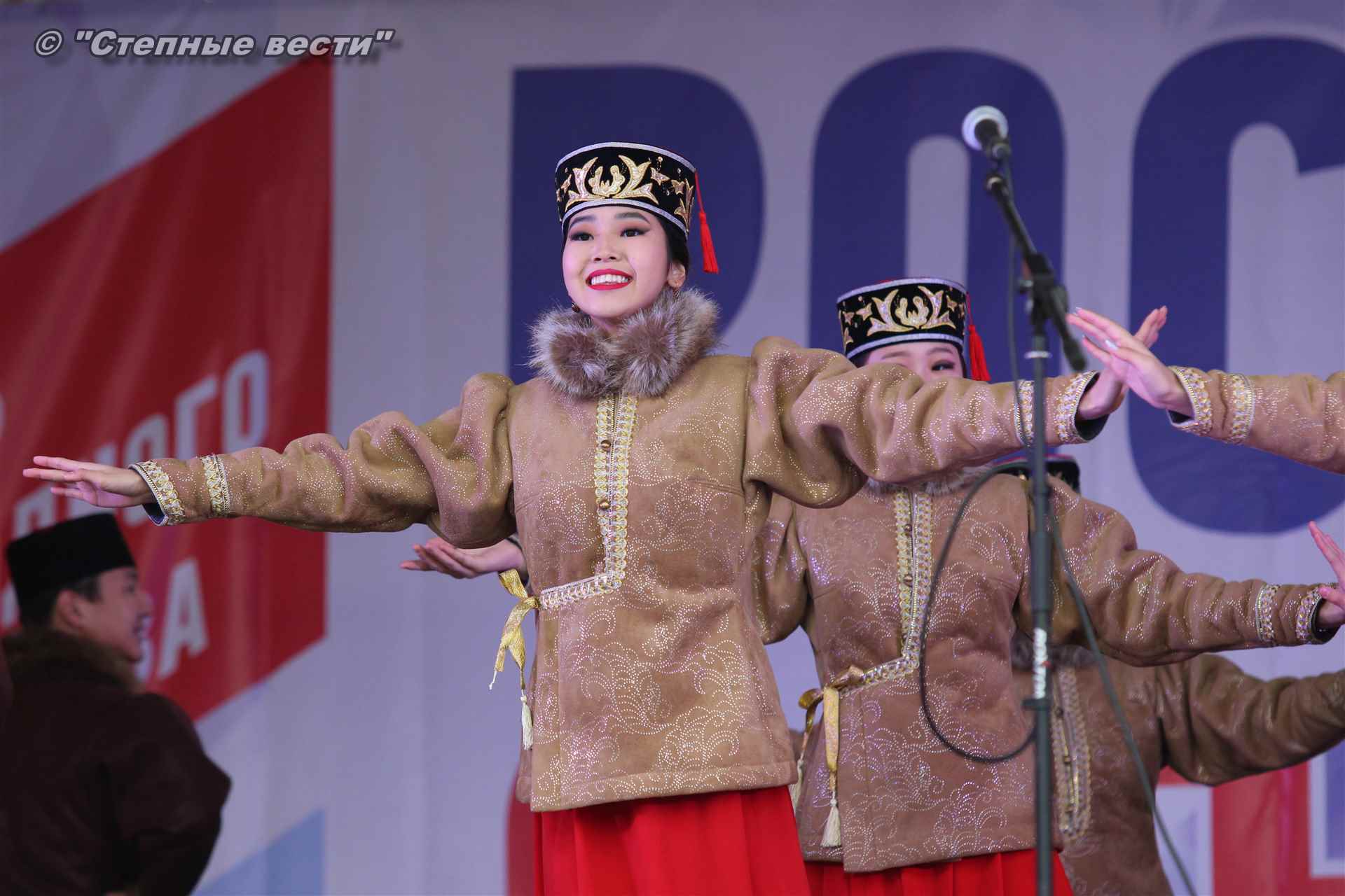 Люди разных возрастов держали в руках флажки, плакаты с надписями «В единстве наша сила», «Пока мы едины, мы непобедимы!» и другими. А юнармейцы развернули у сцены российский триколор и такой же большой флаг Калмыкии.