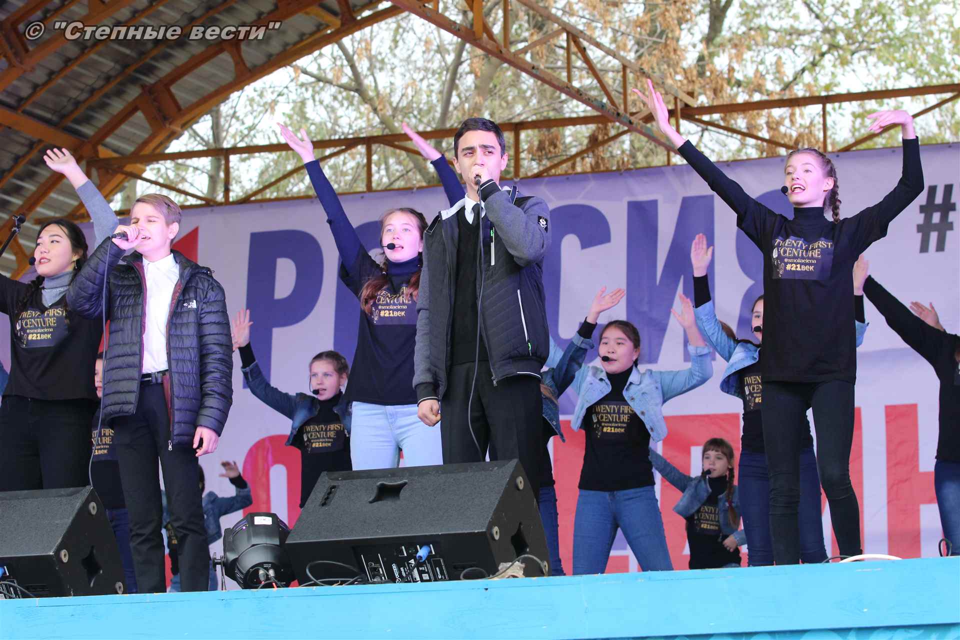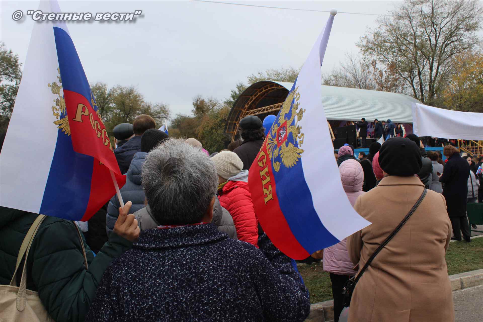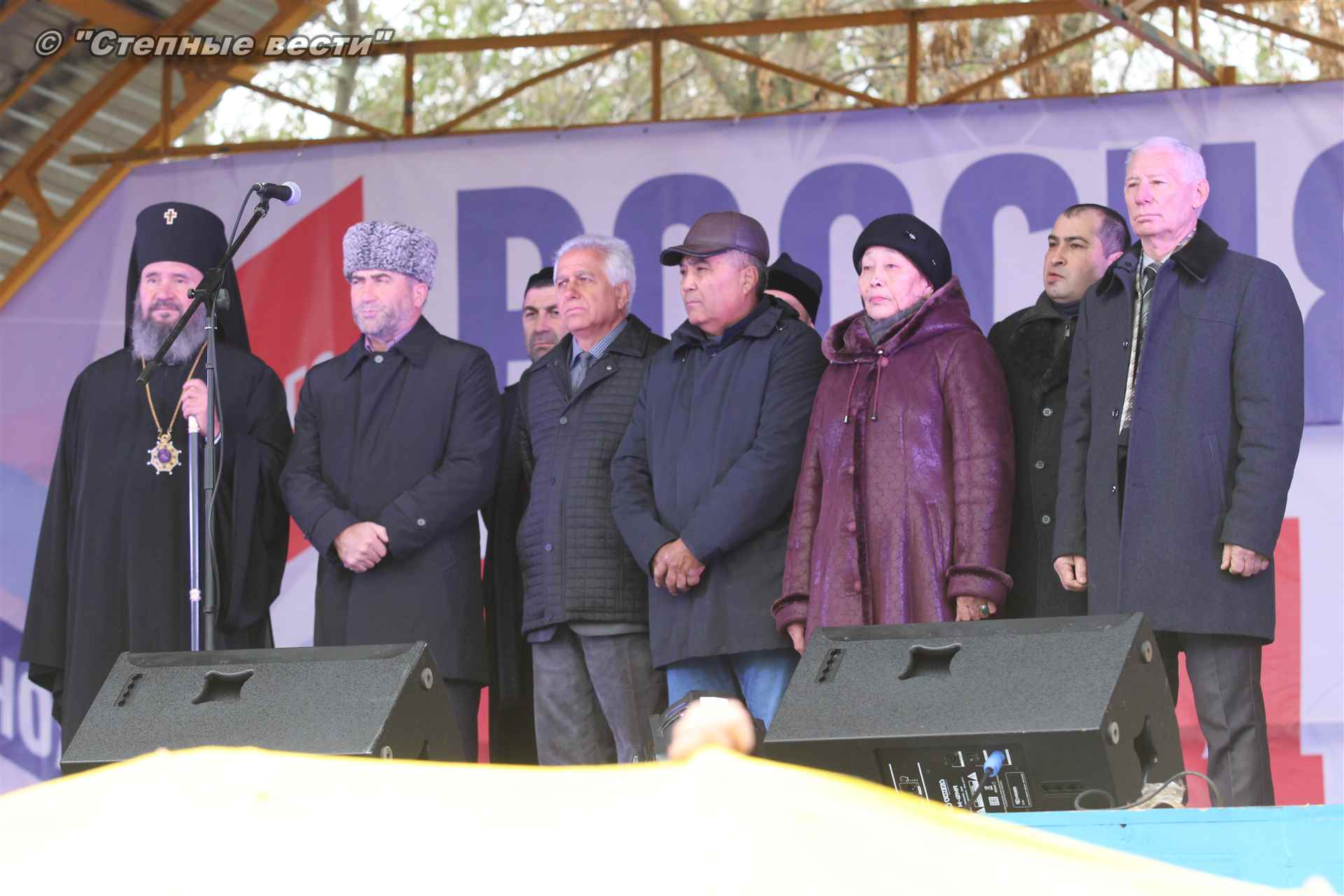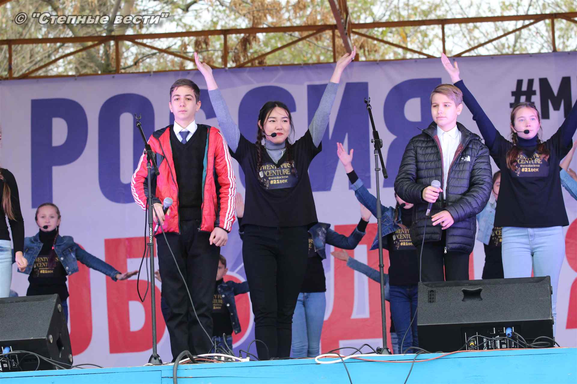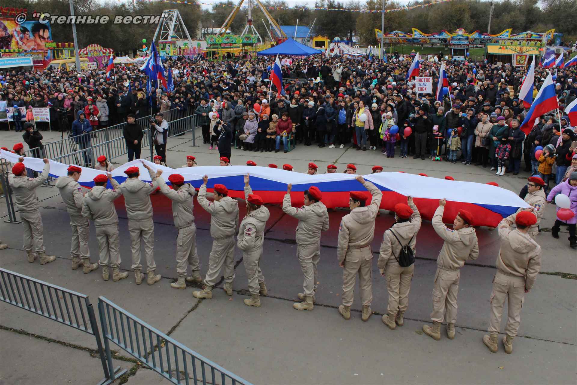 Люди разных возрастов держали в руках флажки, плакаты с надписями «В единстве наша сила», «Пока мы едины, мы непобедимы!» и другими. А юнармейцы развернули у сцены российский триколор и такой же большой флаг Калмыкии.