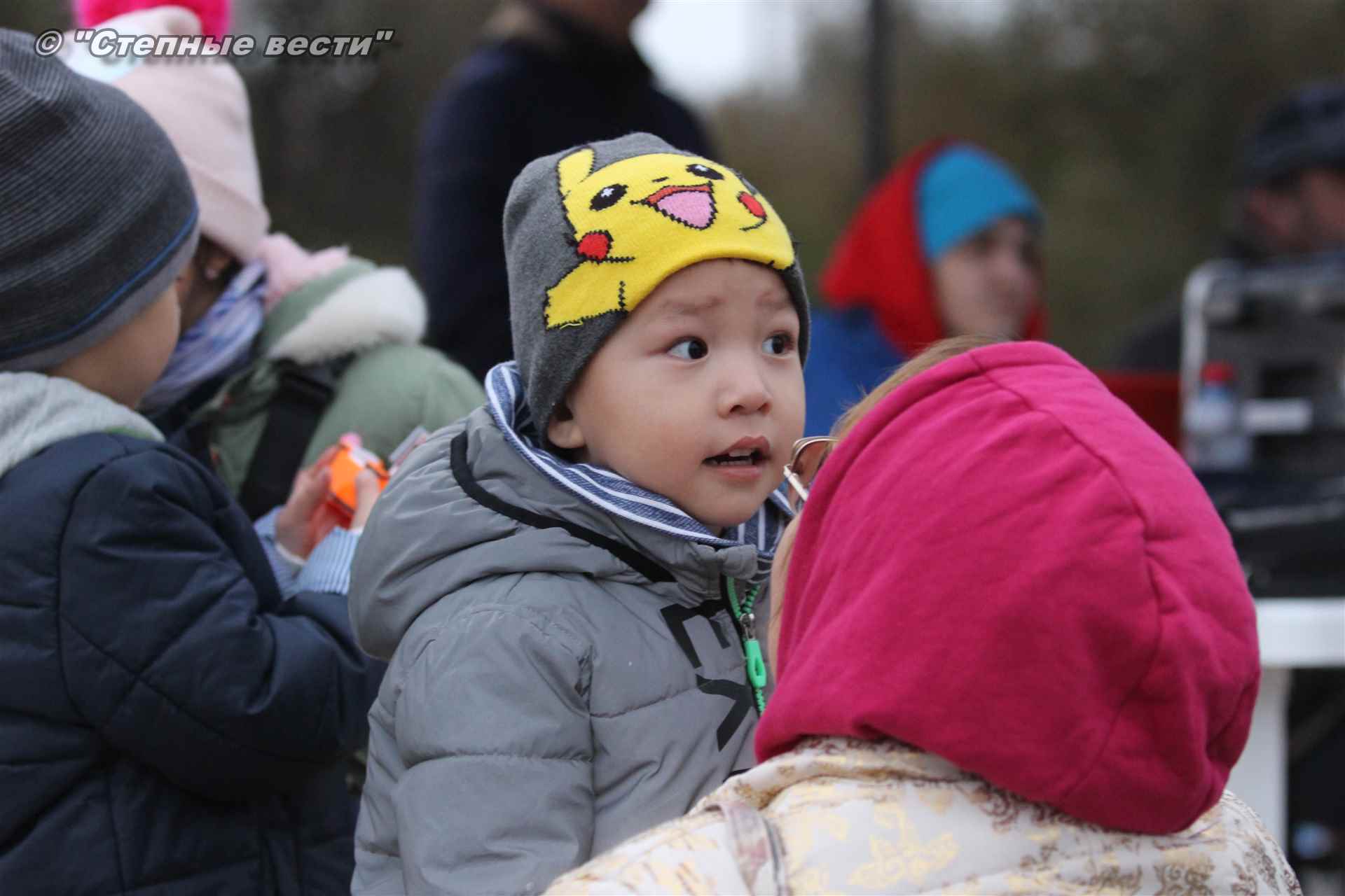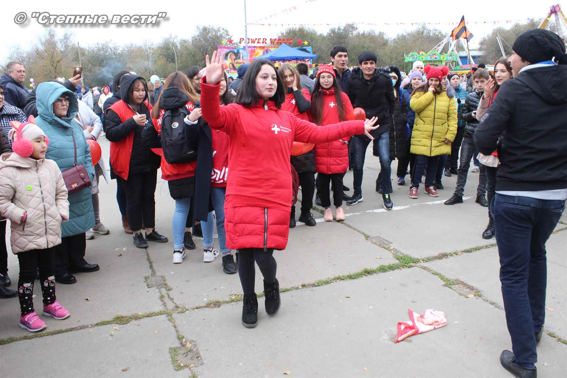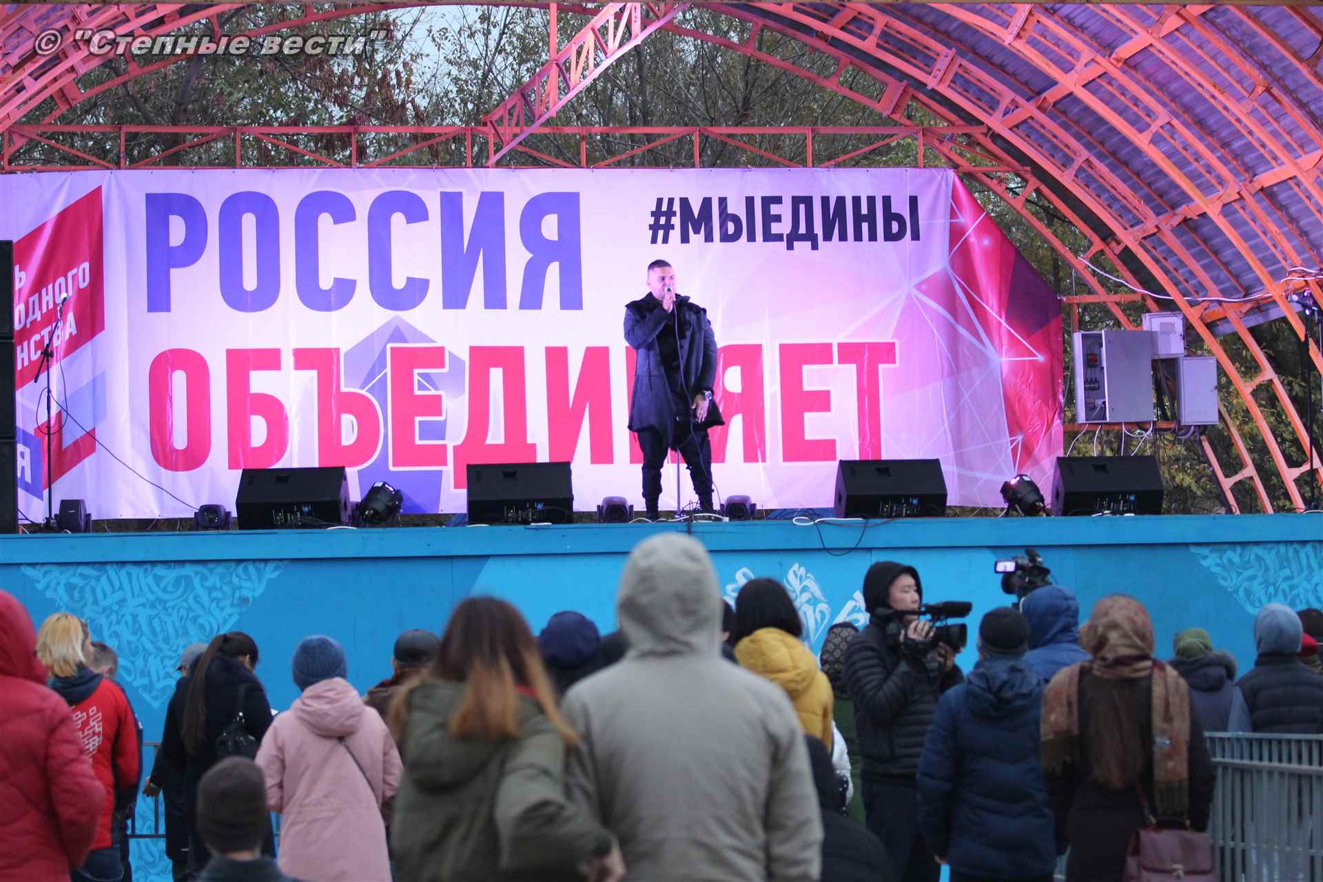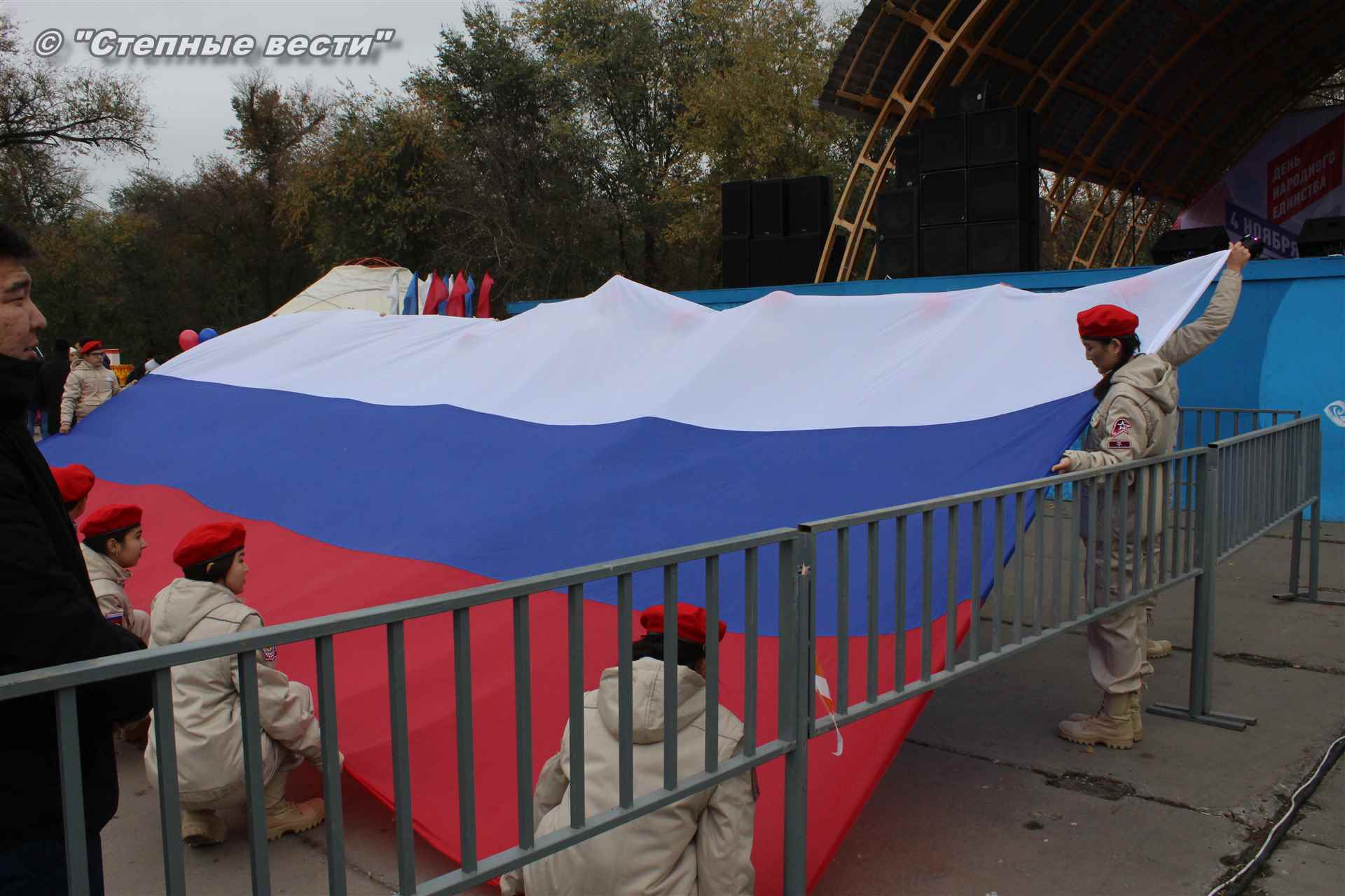 Люди разных возрастов держали в руках флажки, плакаты с надписями «В единстве наша сила», «Пока мы едины, мы непобедимы!» и другими. А юнармейцы развернули у сцены российский триколор и такой же большой флаг Калмыкии.