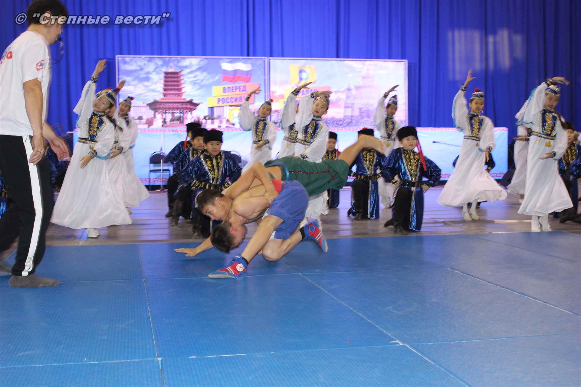 Одновременно с выступлениями юных, но уже вполне опытных артистов,  на счету которых победы во многих хореографических конкурсах и фестивалях, внимание зрителей было приковано к борцовскому ковру, площадке, где состязались лучники. Хватало не только зрелищ, но и «хлеба»: пришедших поболеть за свои команды и всех зрителей в фойе «Ойрат — Арены» бесплатно угощали ароматной джомбой и борцогами. Для любителей селфи была подготовлена фотозона.