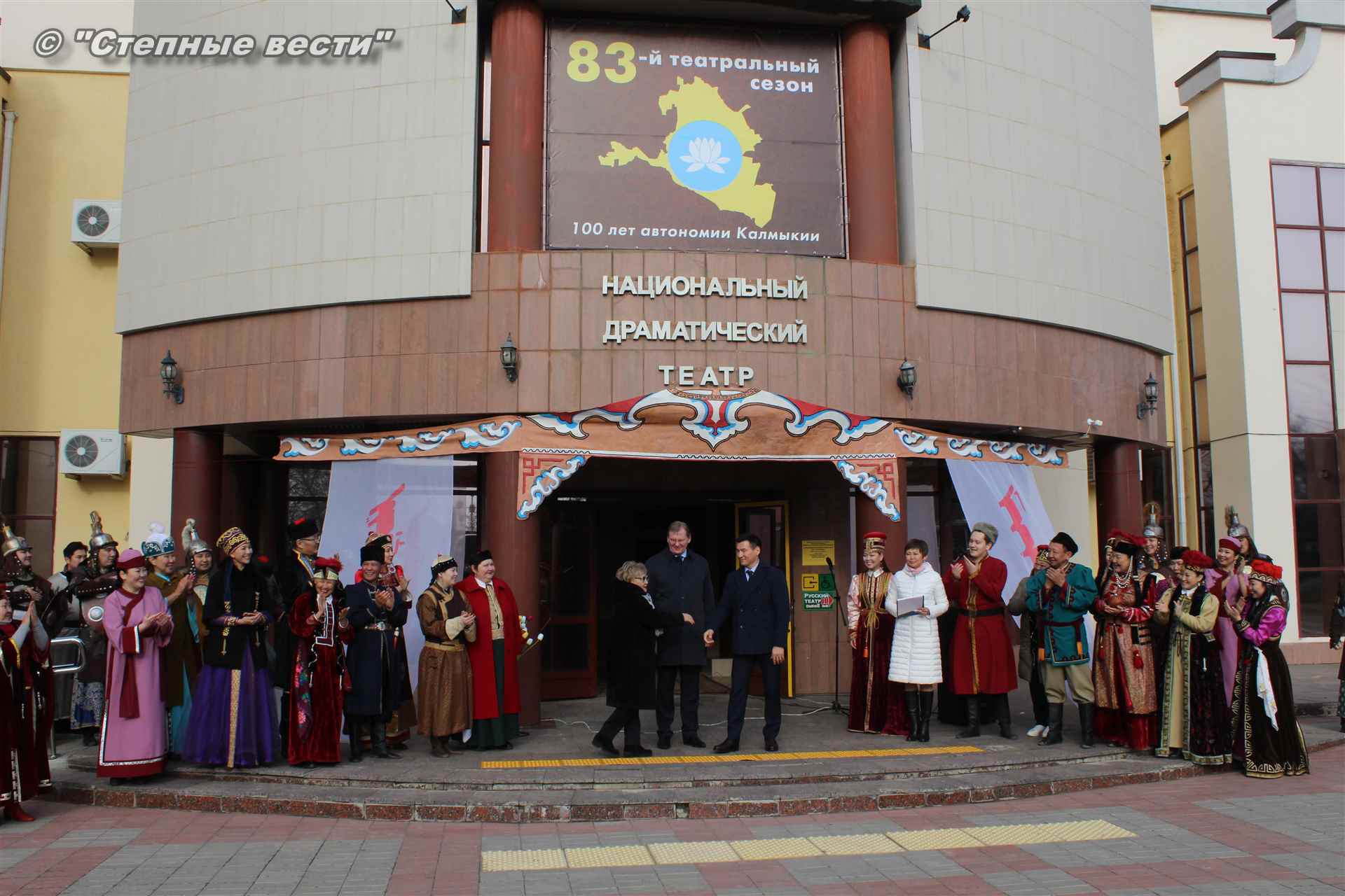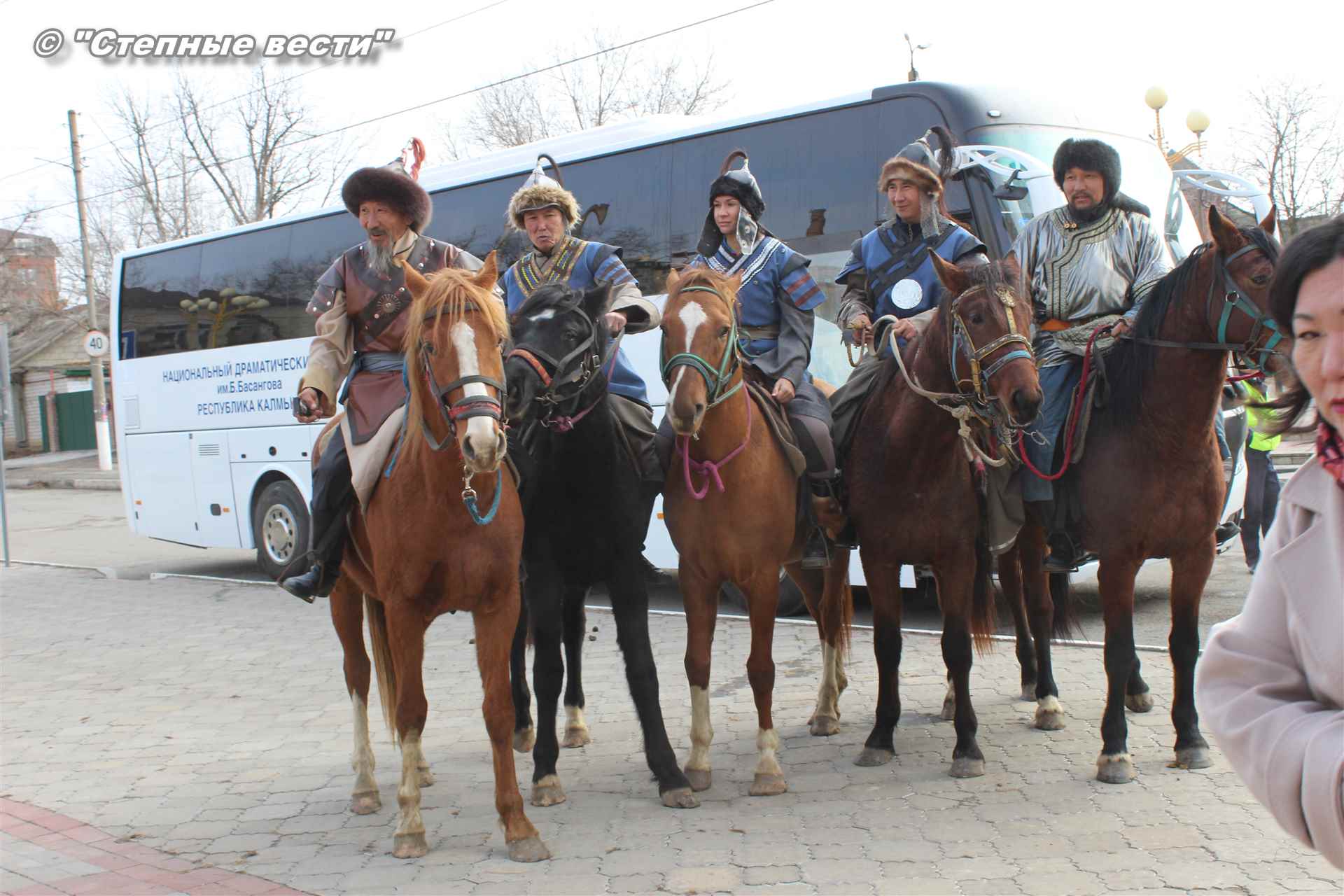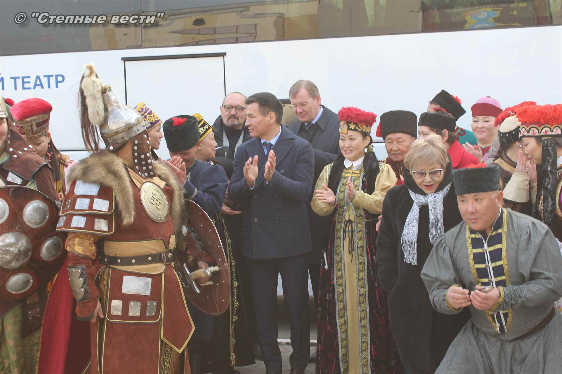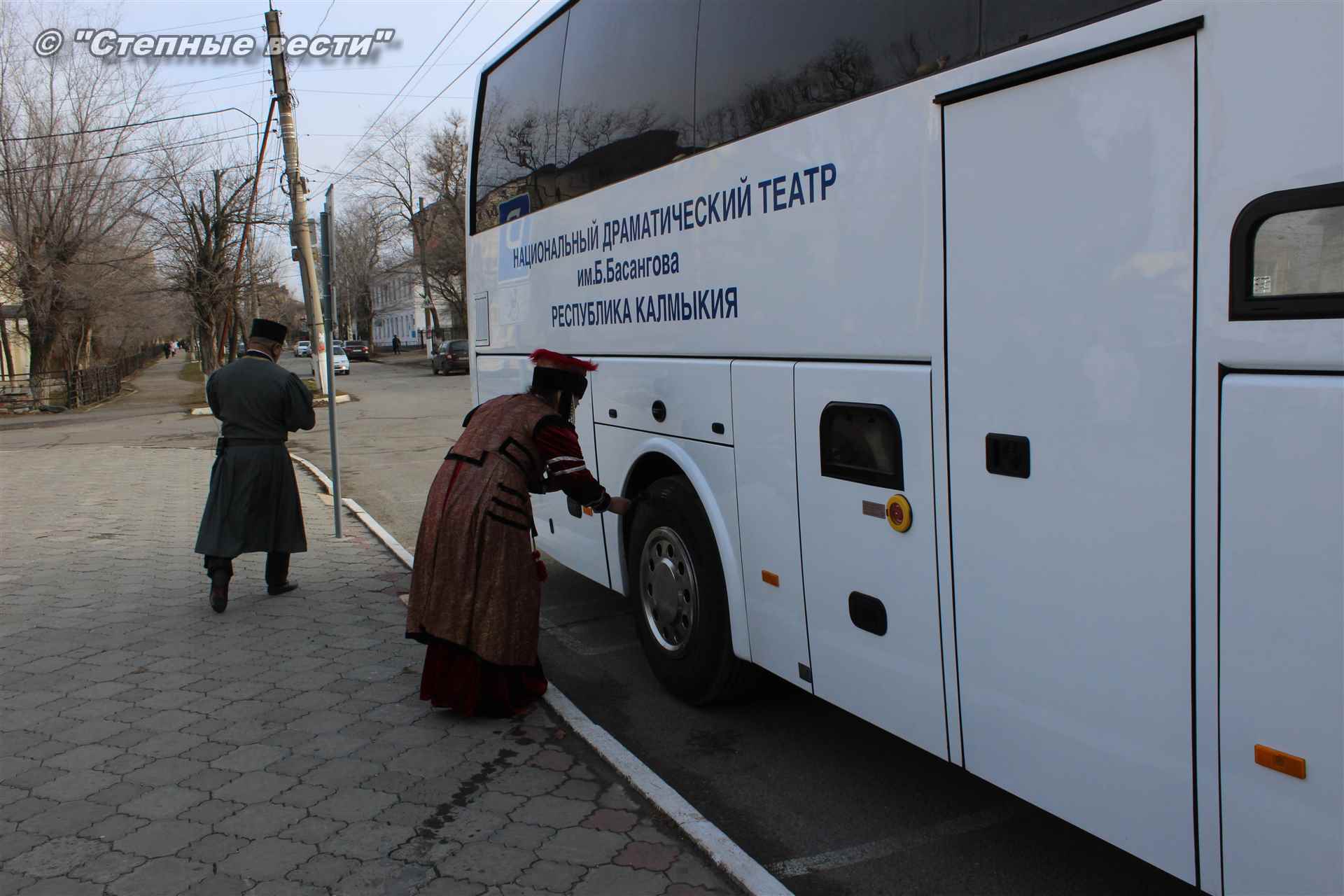 Торжественное вручение автотранспорта работникам творческого учреждения было обставлено соответственно – нетривиально, с элементами театрального действа. Почетных гостей мероприятия – Главу Калмыкии Бату Хасикова и генерального директора КТК-Р Николая Горбаня вышли встретить артисты, одетые в калмыцкие национальные костюмы, в образах героев эпоса «Джангар» — на лошадях и при доспехах.