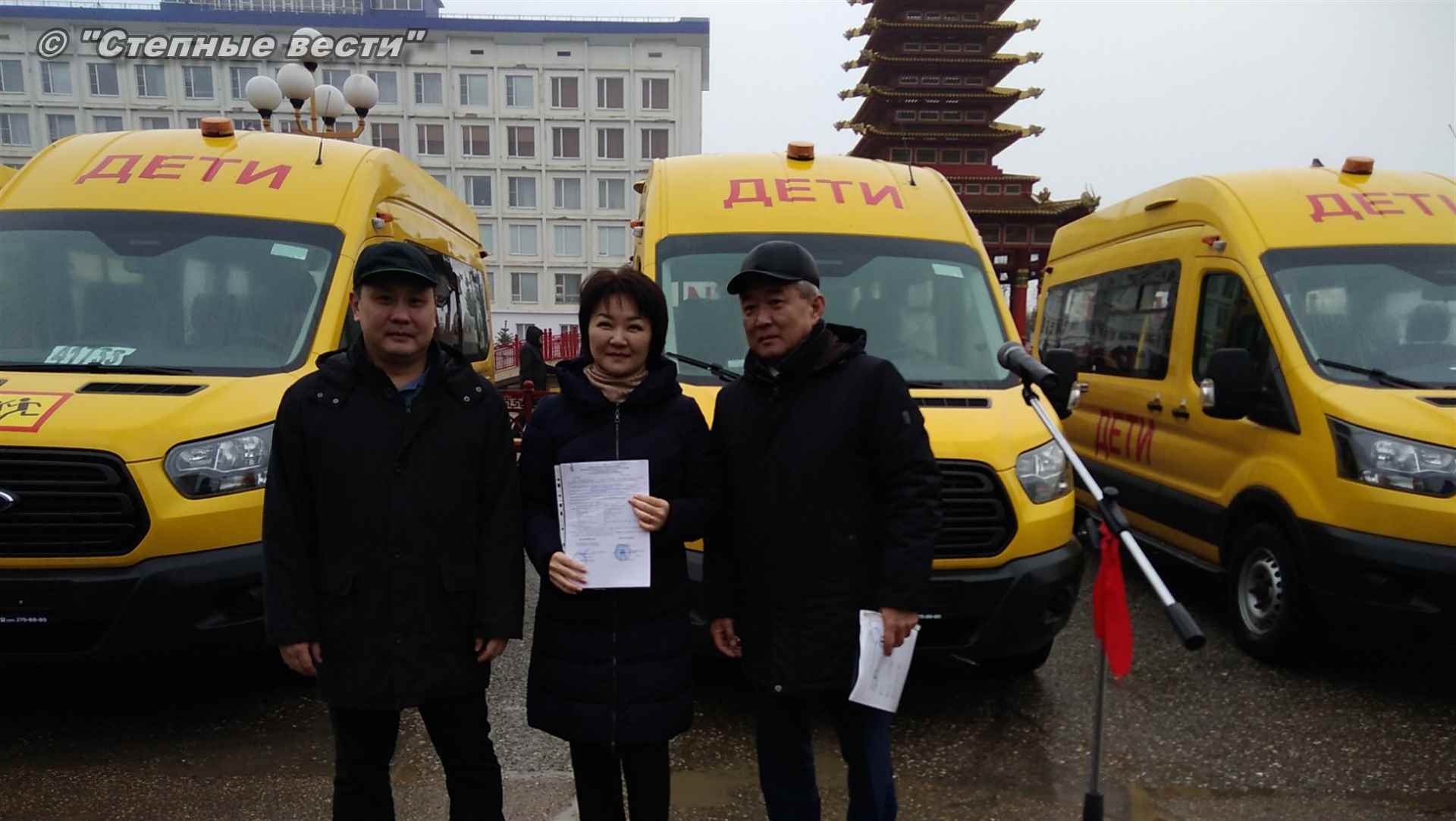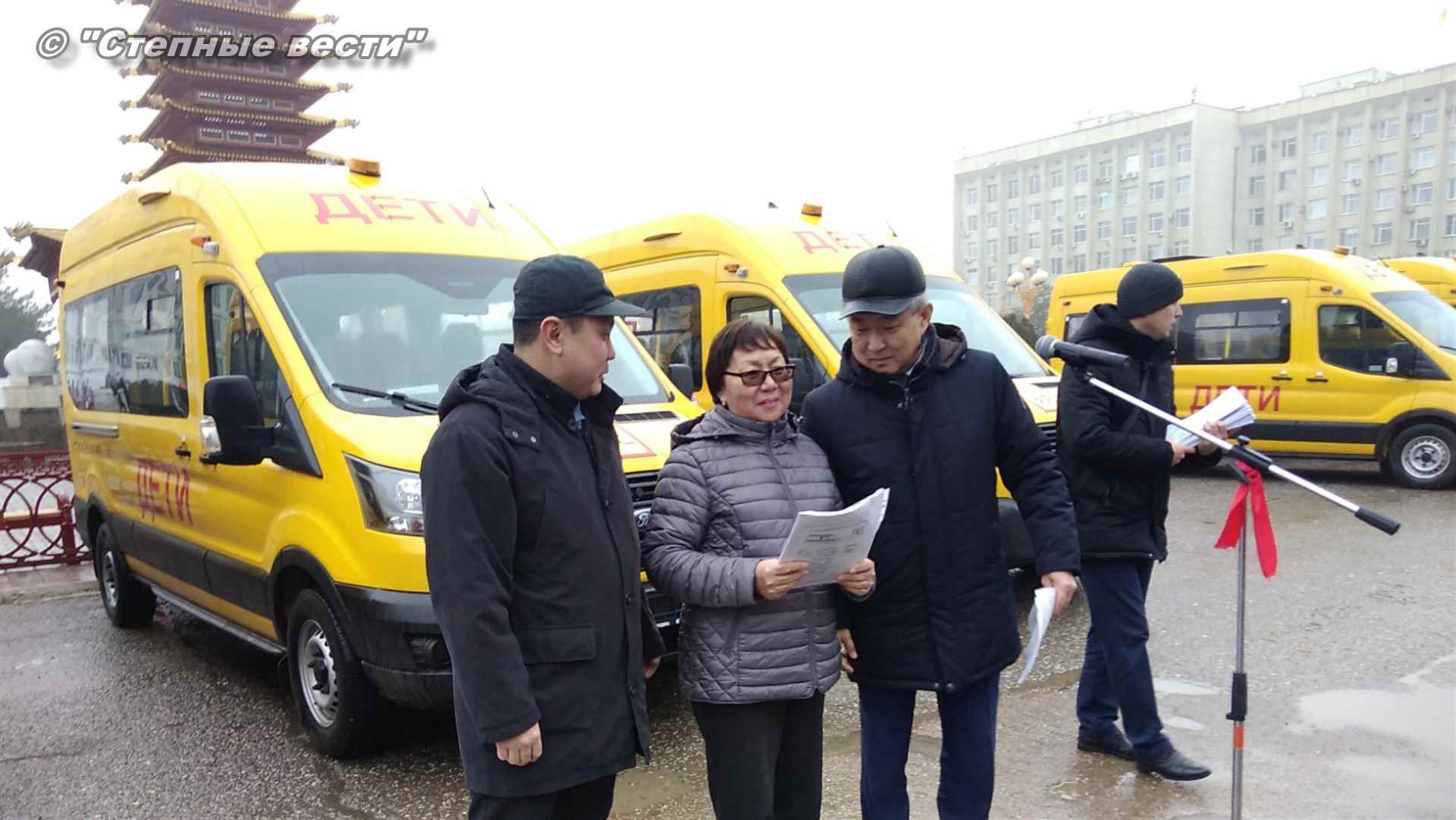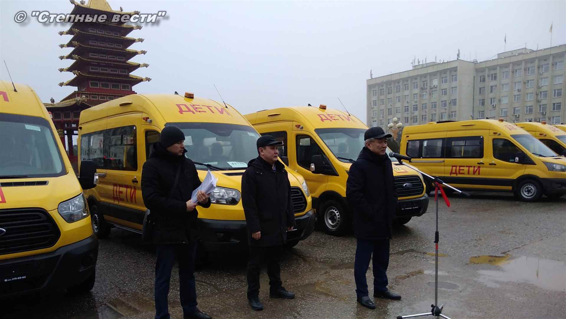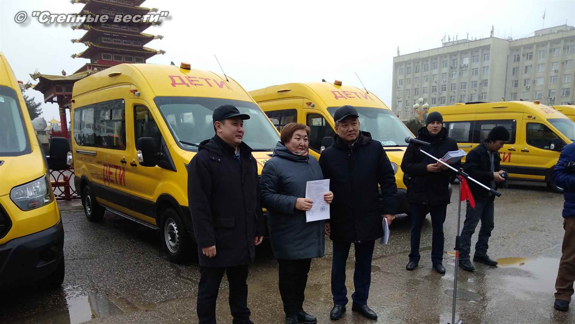 Ключи от новых машин для учеников из его рук получили руководители Хулхутинской, Ульяновской, Веселовской, Кегультинской, Оргакинской, Шарнутовской, Тундутовской, Ханатинской, Татальской, Иджилской, Воробьевской, Партизанской, Ики-Чоносовской, Нарын-Худукской, Привольненской школ, а также Матросовской школы-интерната.