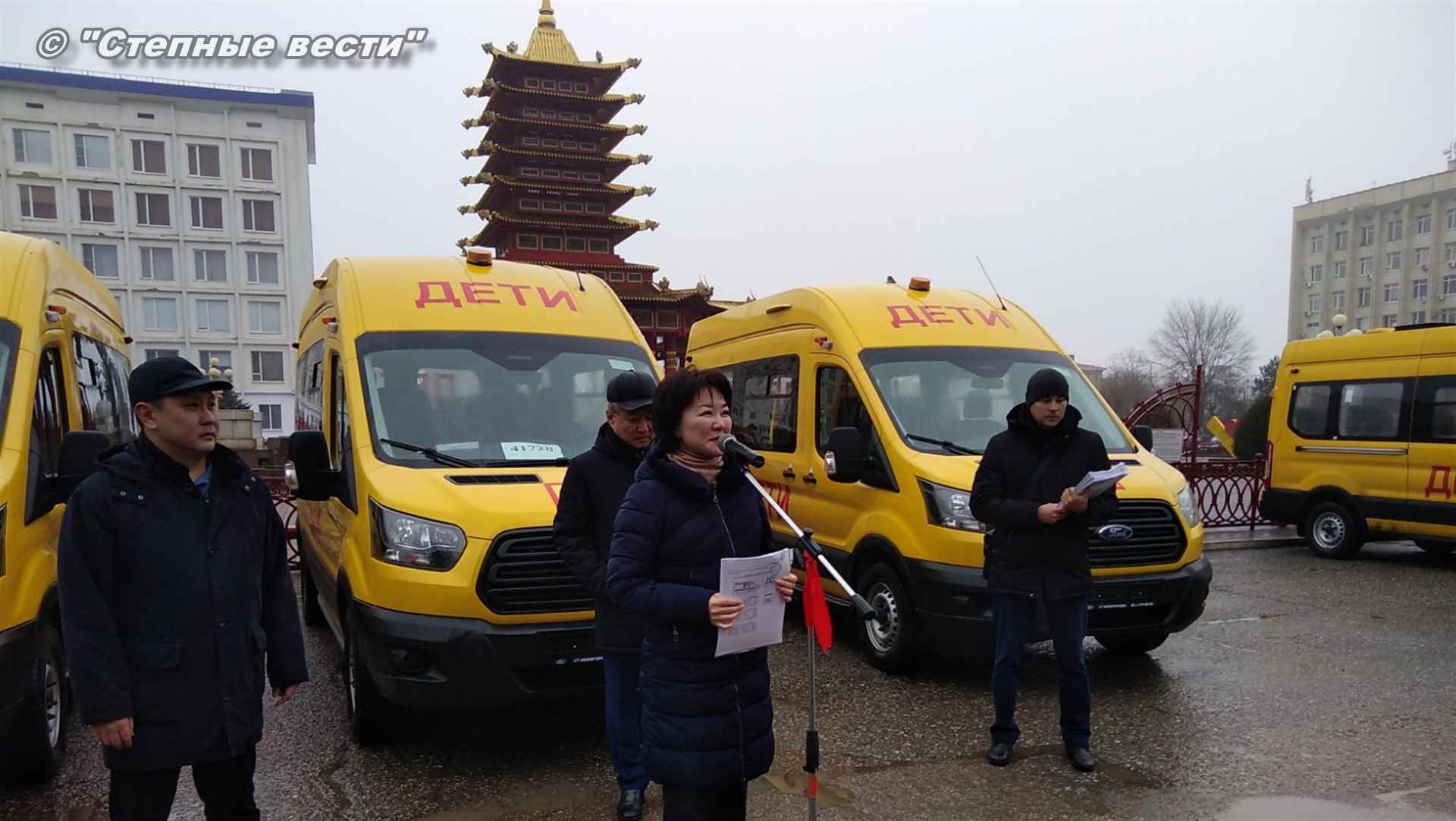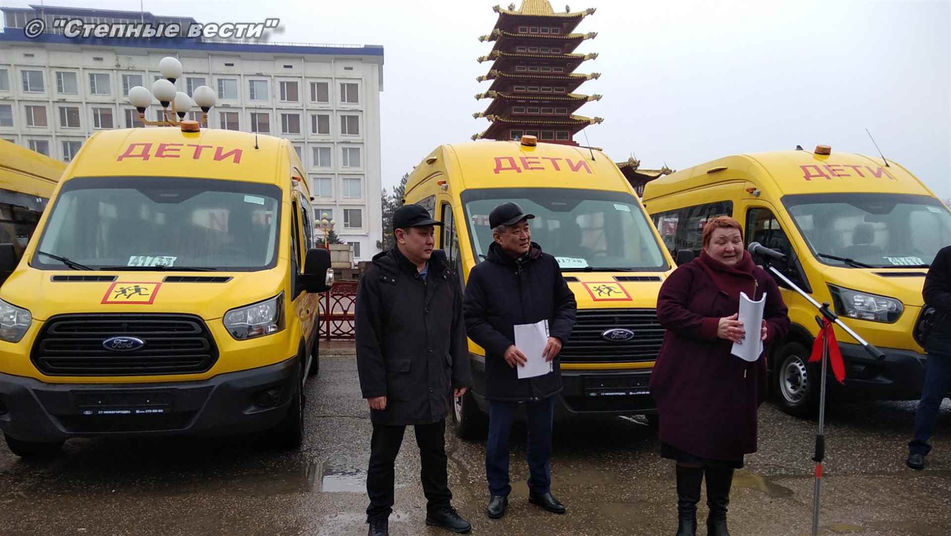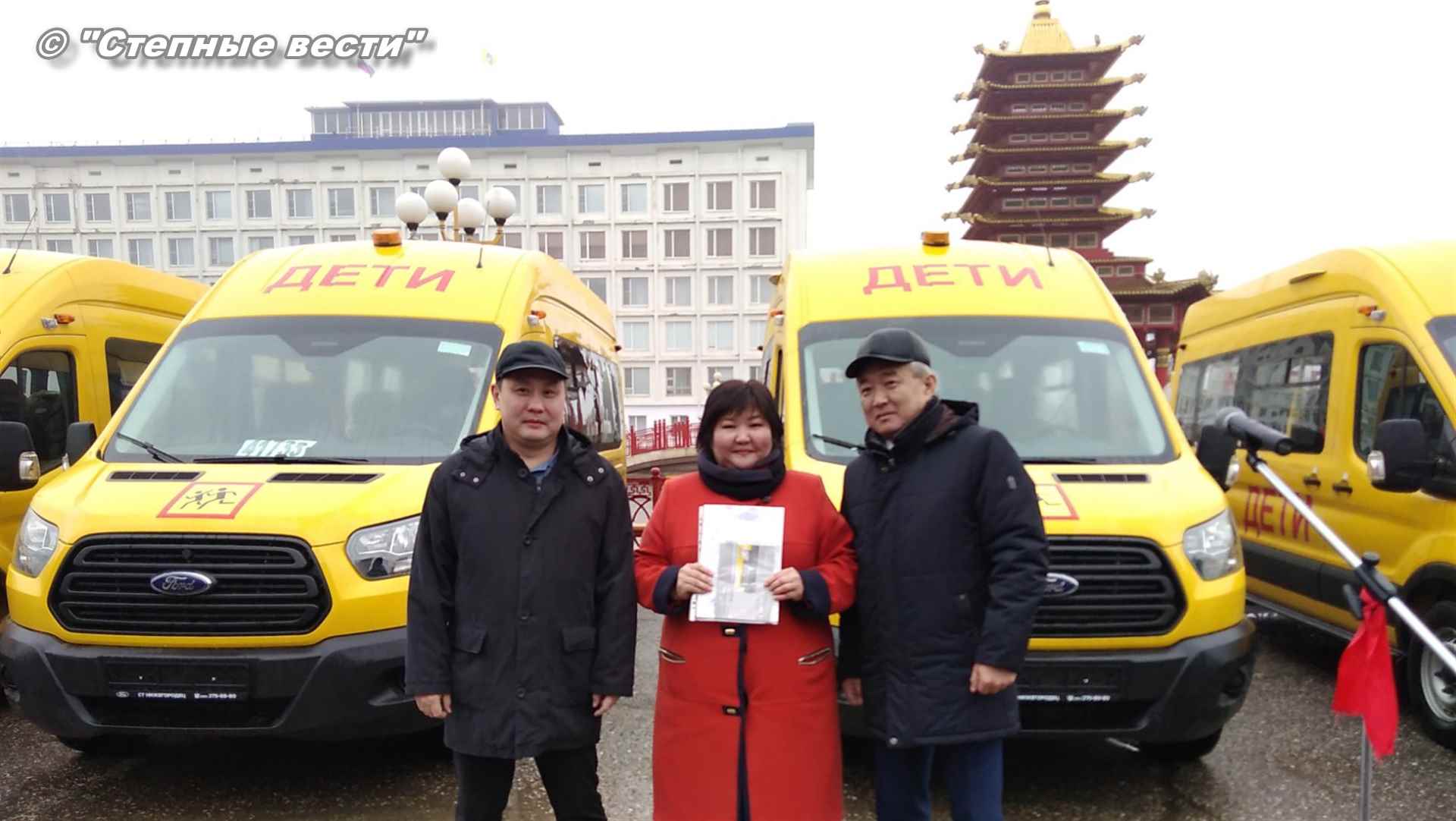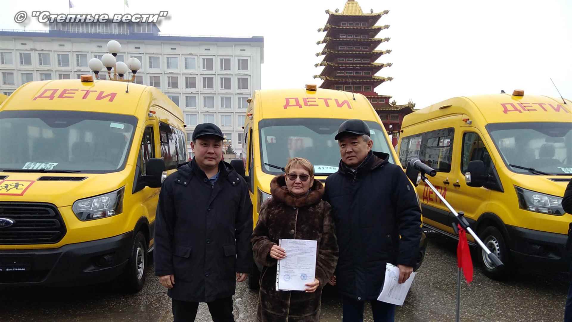 Ключи от новых машин для учеников из его рук получили руководители Хулхутинской, Ульяновской, Веселовской, Кегультинской, Оргакинской, Шарнутовской, Тундутовской, Ханатинской, Татальской, Иджилской, Воробьевской, Партизанской, Ики-Чоносовской, Нарын-Худукской, Привольненской школ, а также Матросовской школы-интерната.