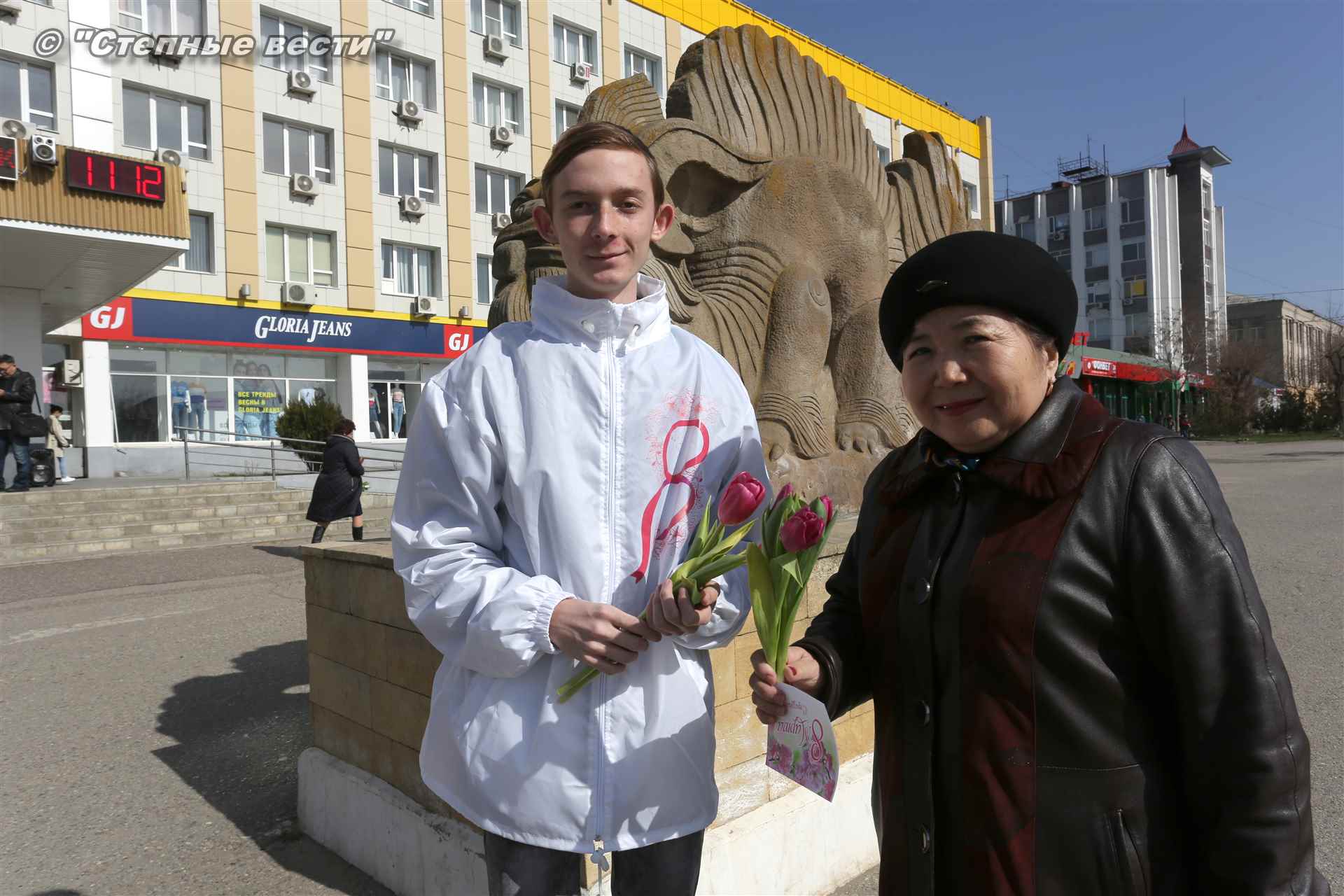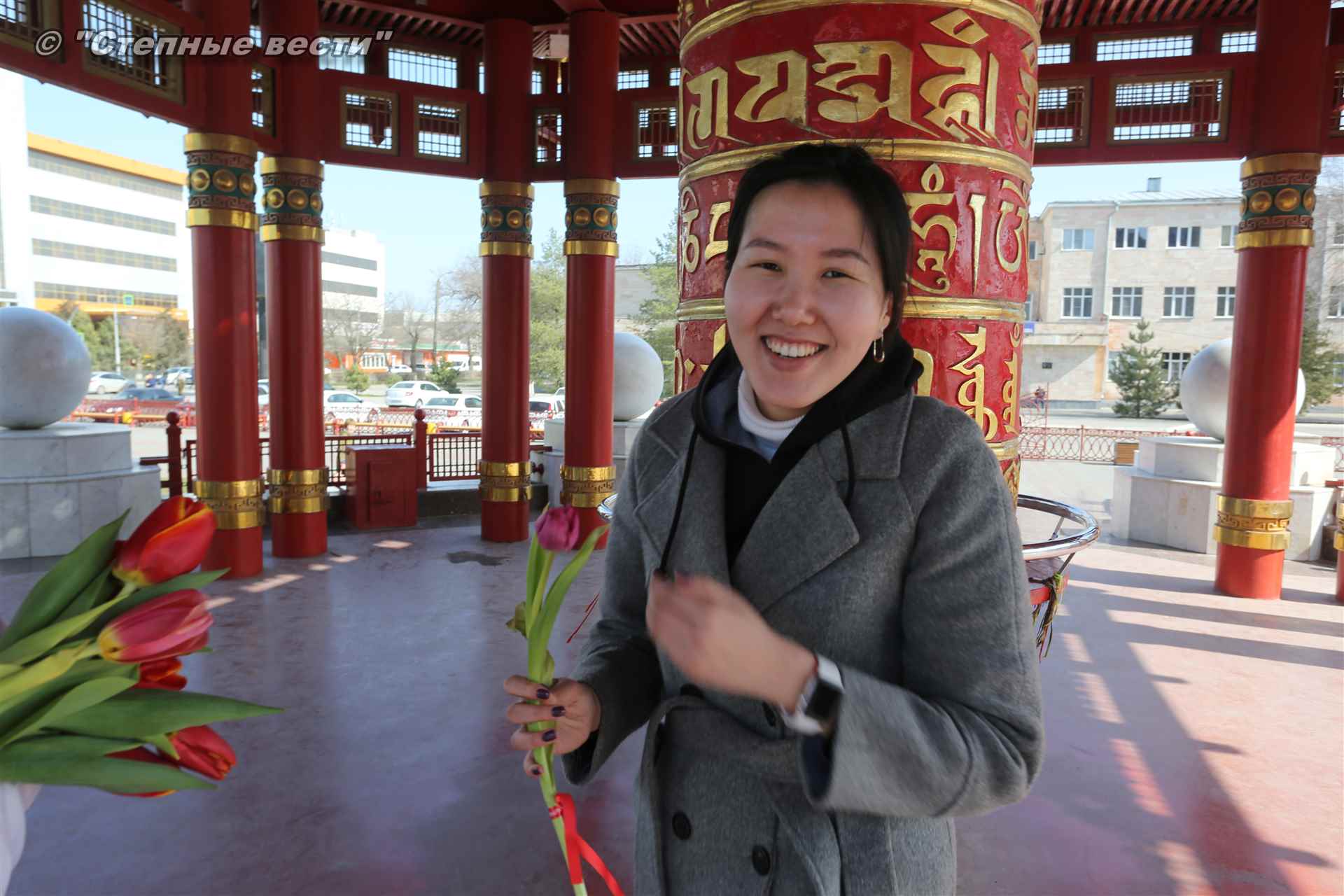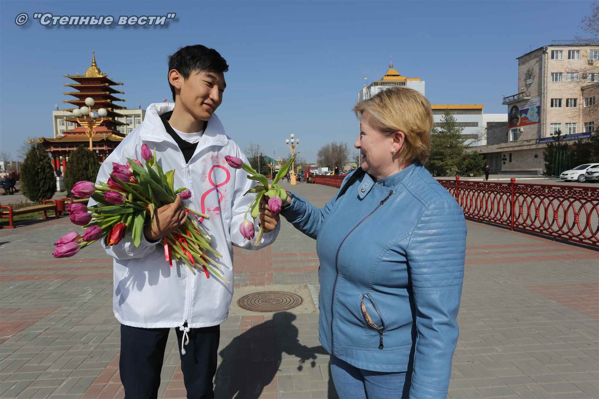 Неожиданные подарки – нежные весенние цветы – достались пассажиркам и кассирам маршрутных такси и городских автобусов на остановках возле Центрального хурула Калмыкии «Золотая обитель Будды Шакьямуни» и в самом центре столицы республики – у гостиницы «Элиста». Девочки, девушки, женщины и бабушки, которых поздравили с Международным женским днем, в ответ дарили свои улыбки и от души благодарили молодежь. По мнению бабушек, волонтеры, участвуя в народной акции, делая доброе дело в этот солнечный праздничный день, накопили буйн (добродетели, духовные заслуги).