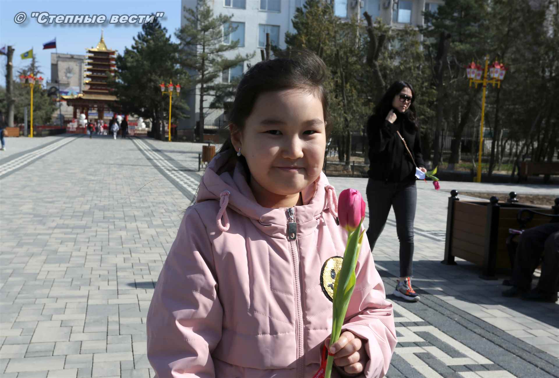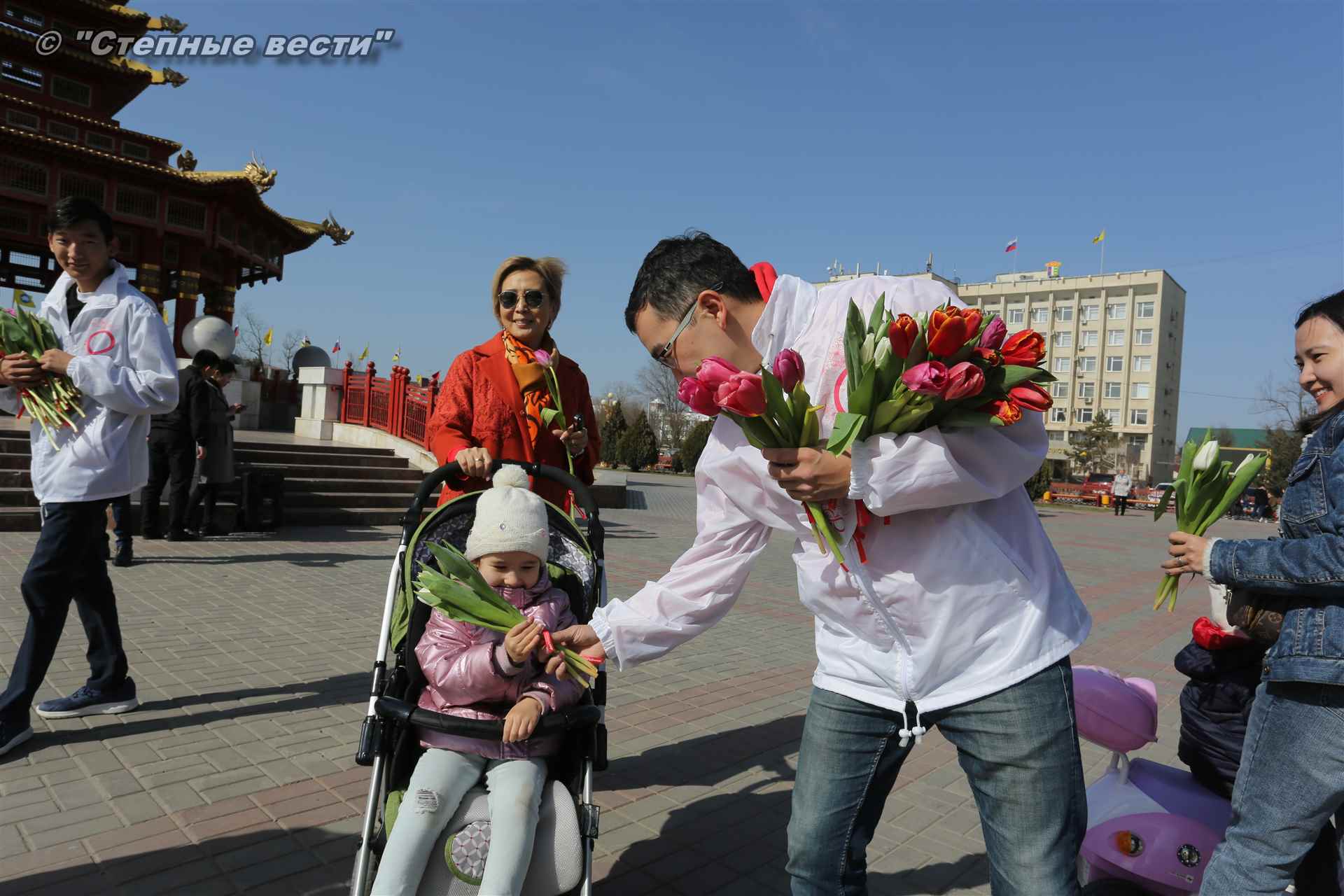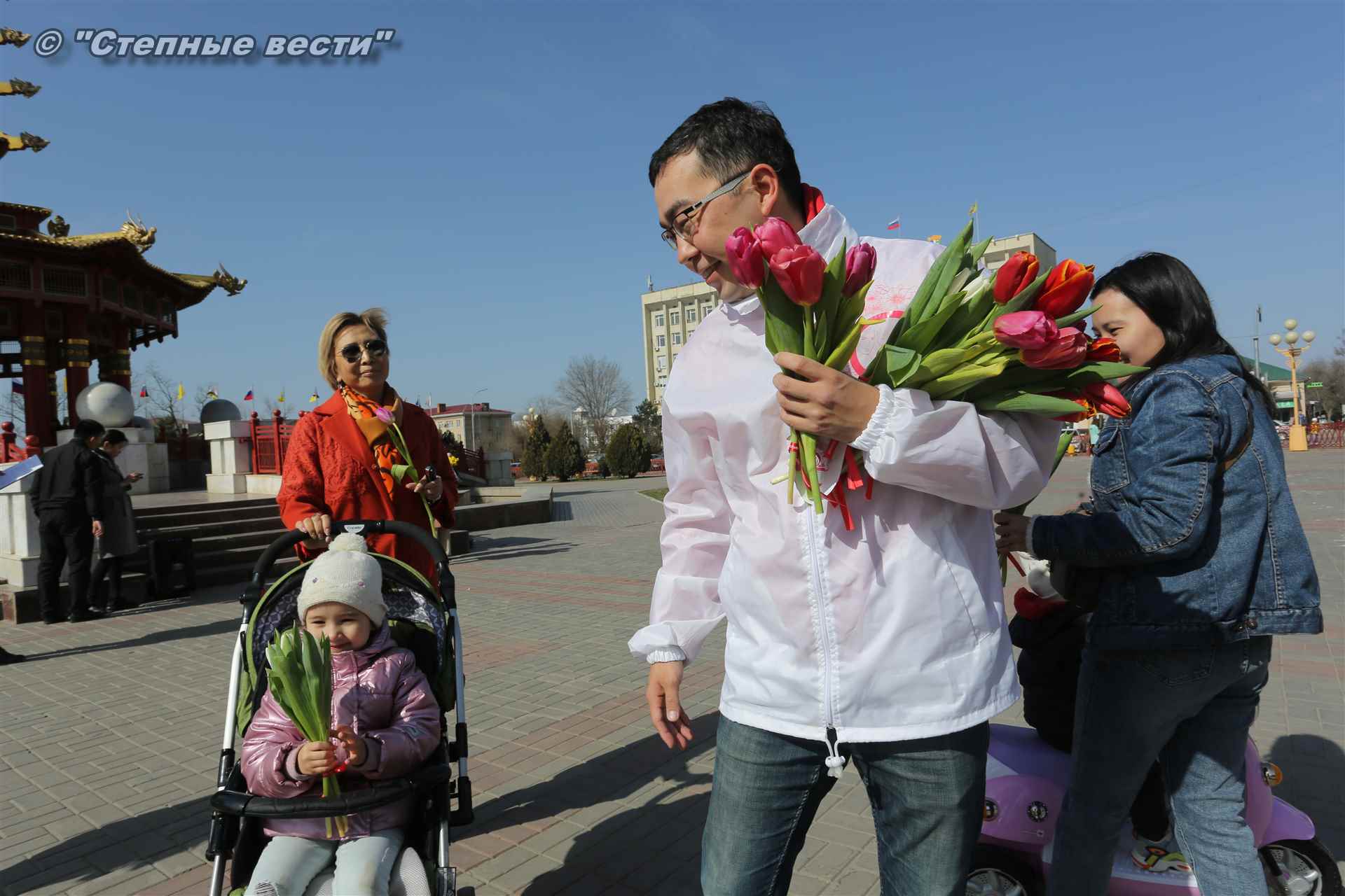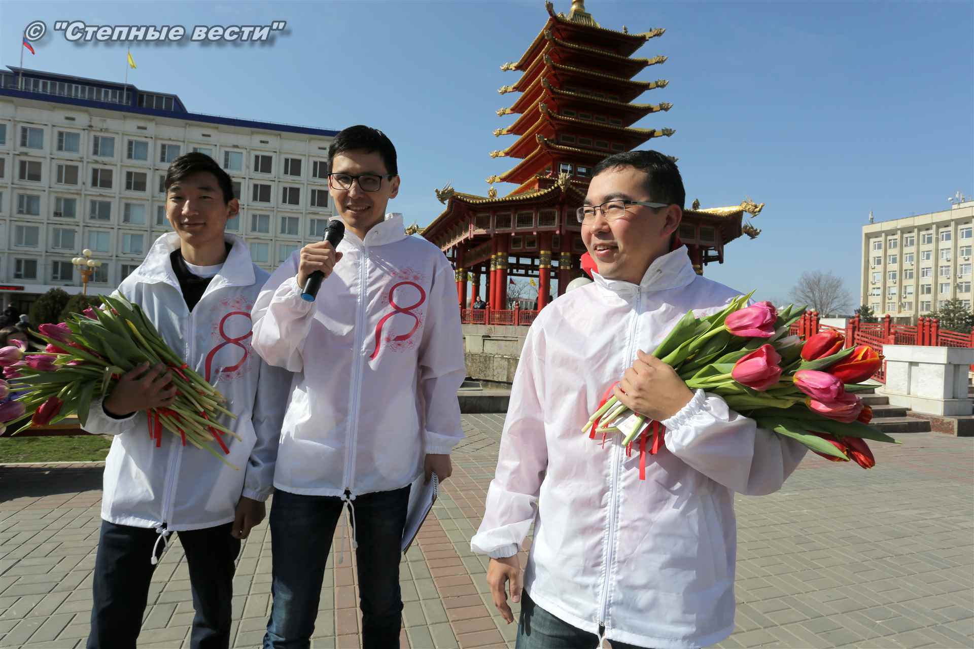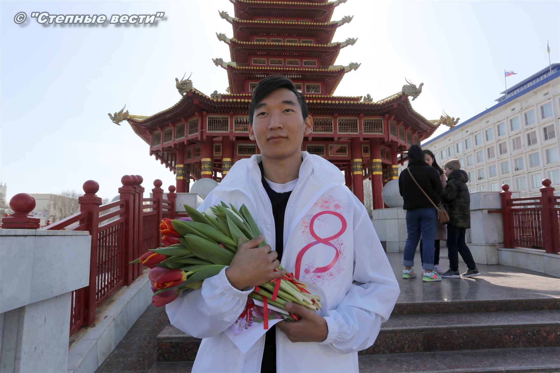 Прохожие – мамы с детьми, бабушки, старшеклассницы, студентки, спешащие по своим делам и проходившие по территории культурного центра «Пагода Семи дней», тоже были приятно удивлены поздравлениями с 8 марта от незнакомых людей, подаривших небольшие букеты. Некоторым из них здоровья, радости и счастья пожелал министр спорта и молодежной политики РК Дорджи Шикеев, принявший участие в акции в центре города.
