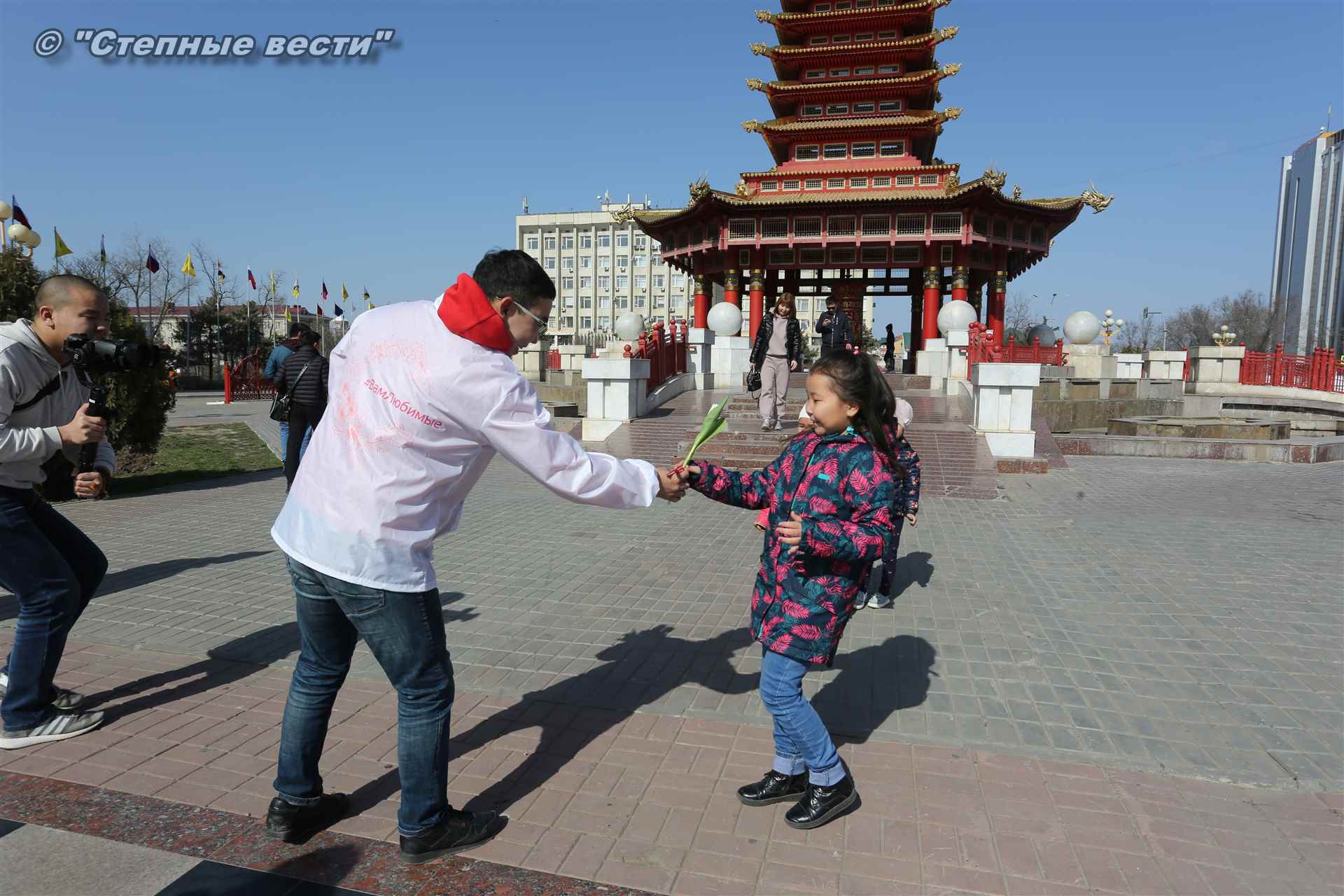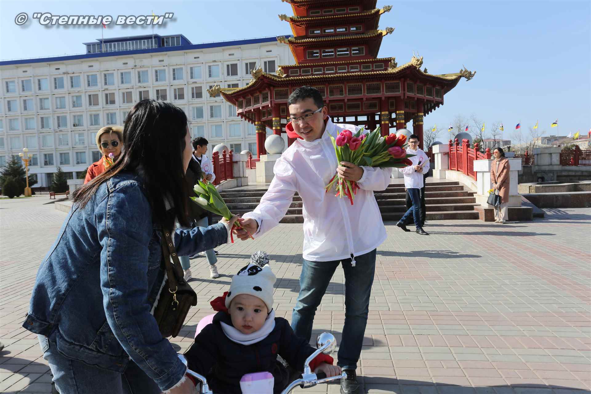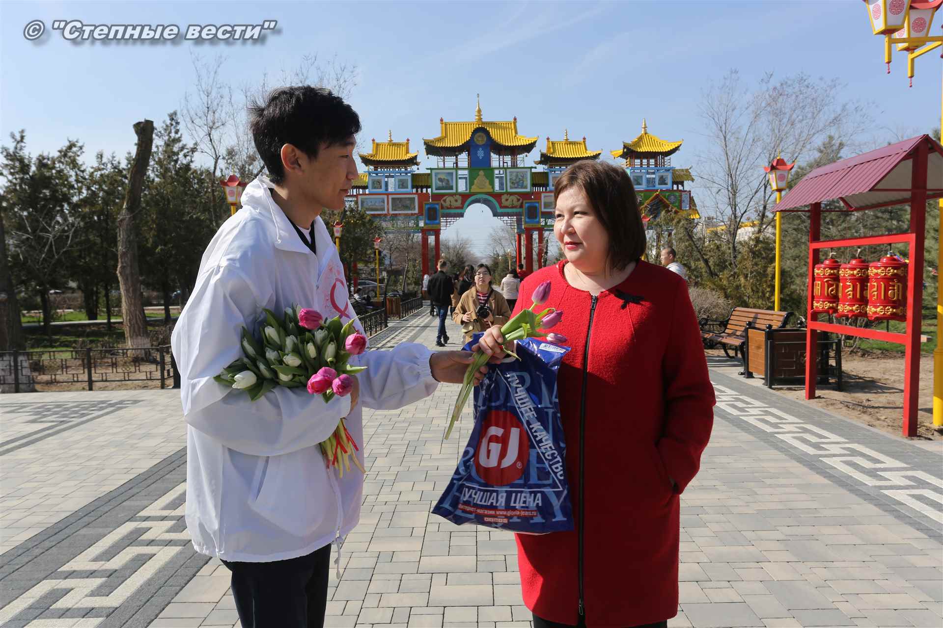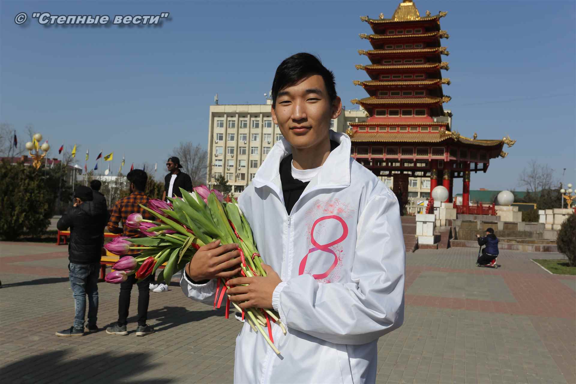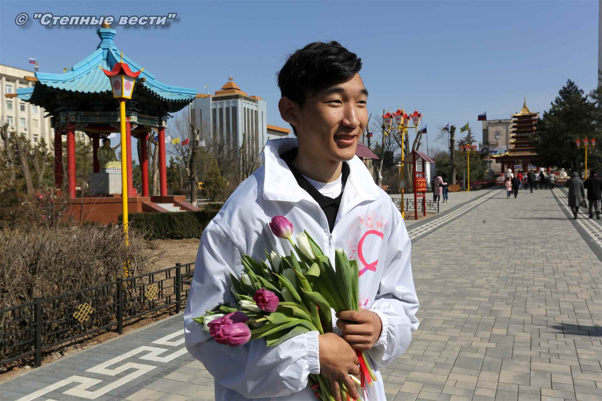 Прохожие – мамы с детьми, бабушки, старшеклассницы, студентки, спешащие по своим делам и проходившие по территории культурного центра «Пагода Семи дней», тоже были приятно удивлены поздравлениями с 8 марта от незнакомых людей, подаривших небольшие букеты. Некоторым из них здоровья, радости и счастья пожелал министр спорта и молодежной политики РК Дорджи Шикеев, принявший участие в акции в центре города.