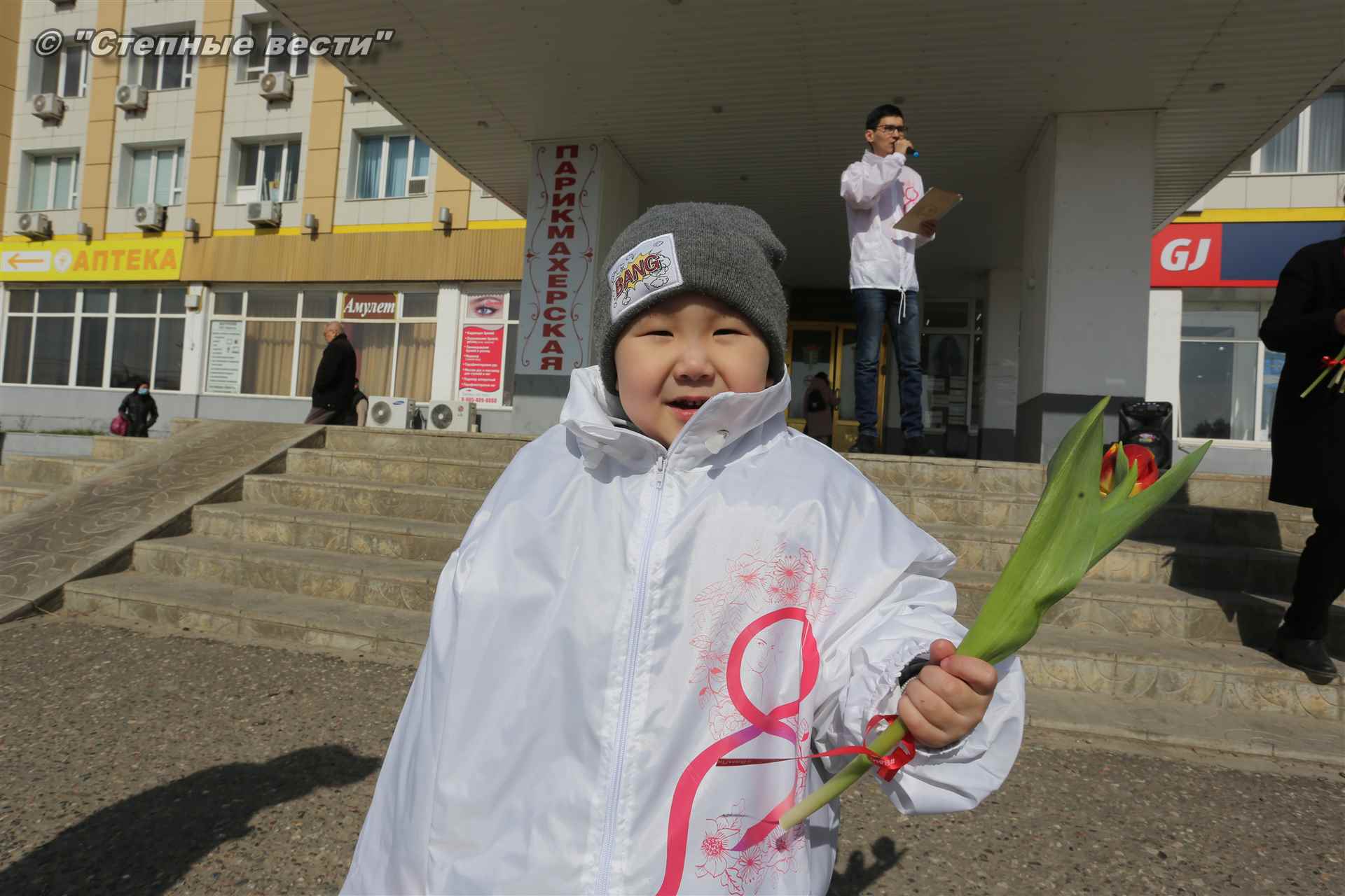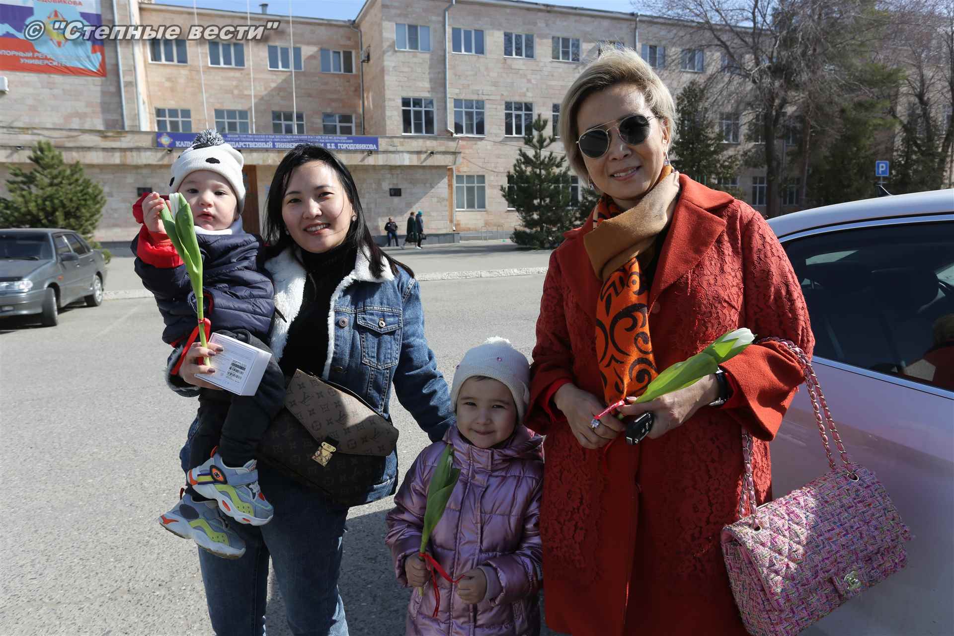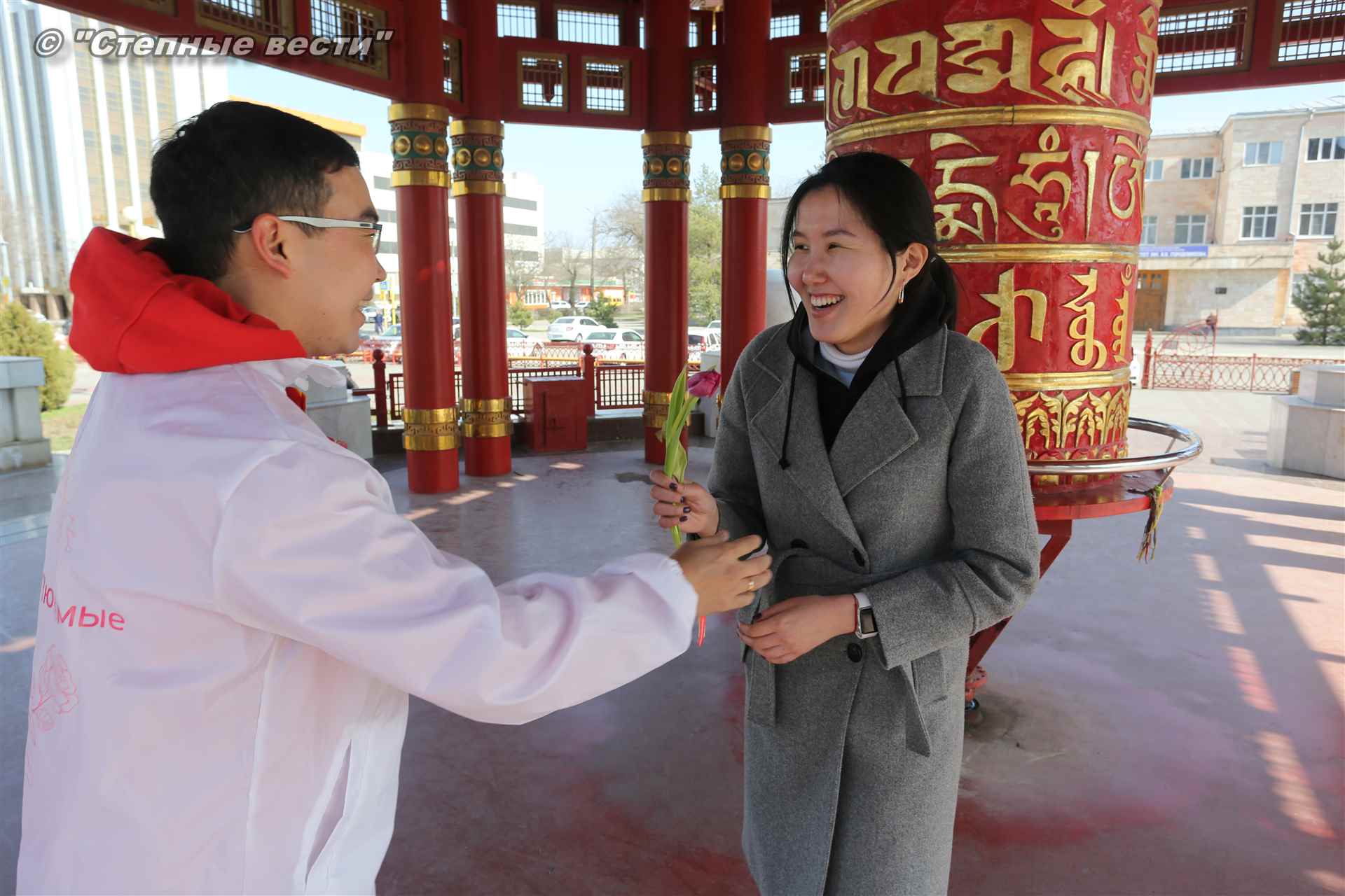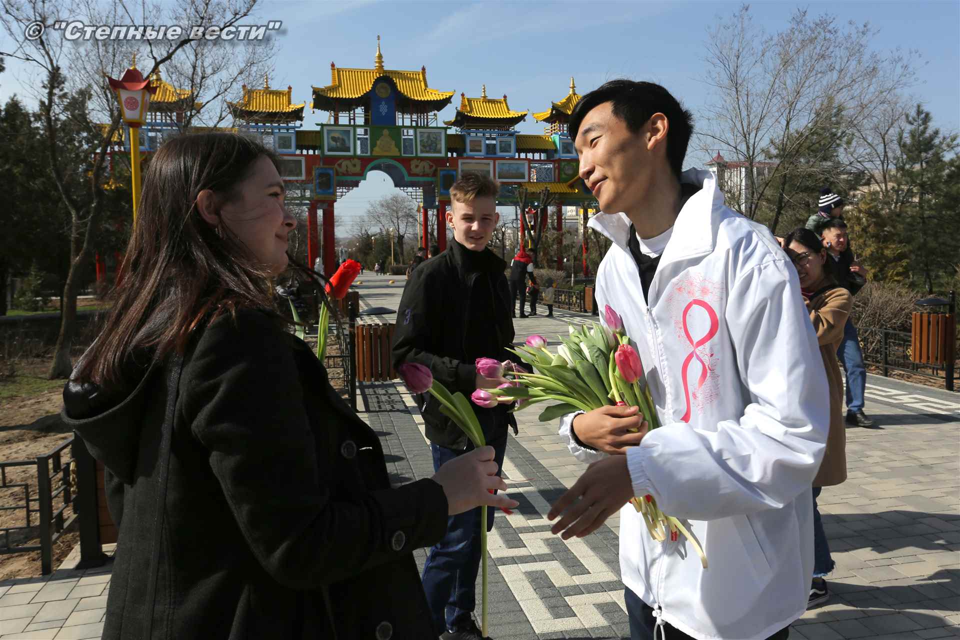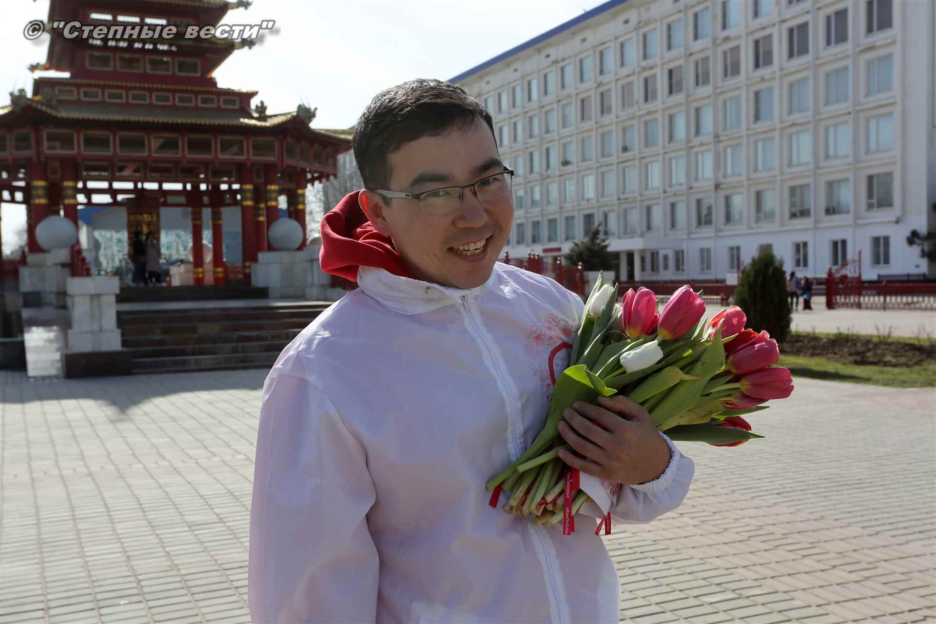 Прохожие – мамы с детьми, бабушки, старшеклассницы, студентки, спешащие по своим делам и проходившие по территории культурного центра «Пагода Семи дней», тоже были приятно удивлены поздравлениями с 8 марта от незнакомых людей, подаривших небольшие букеты. Некоторым из них здоровья, радости и счастья пожелал министр спорта и молодежной политики РК Дорджи Шикеев, принявший участие в акции в центре города.