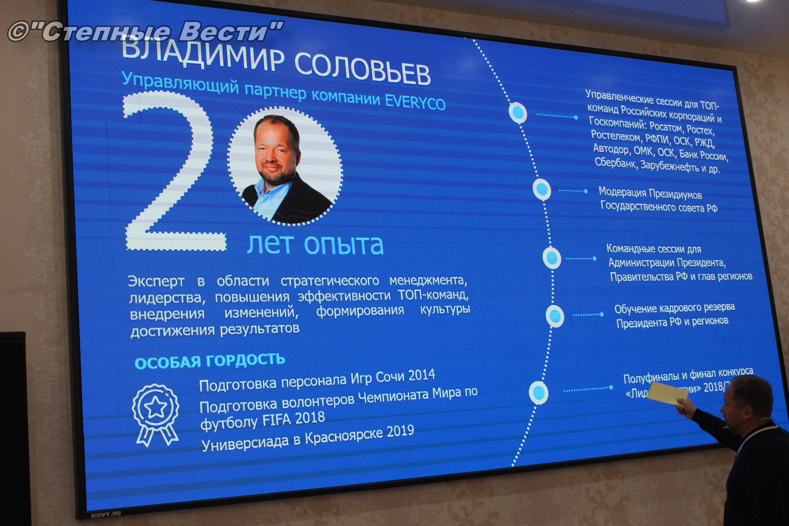 «Сегодня на встрече с финалистами конкурса «Лидеры Калмыкии» царила особая атмосфера. Специально на финальный этап в Калмыкию приехал один из самых известных, востребованных и опытных коучей, основатель и управляющий партнёр Группы компаний Everyco @everyco Владимир Соловьев.